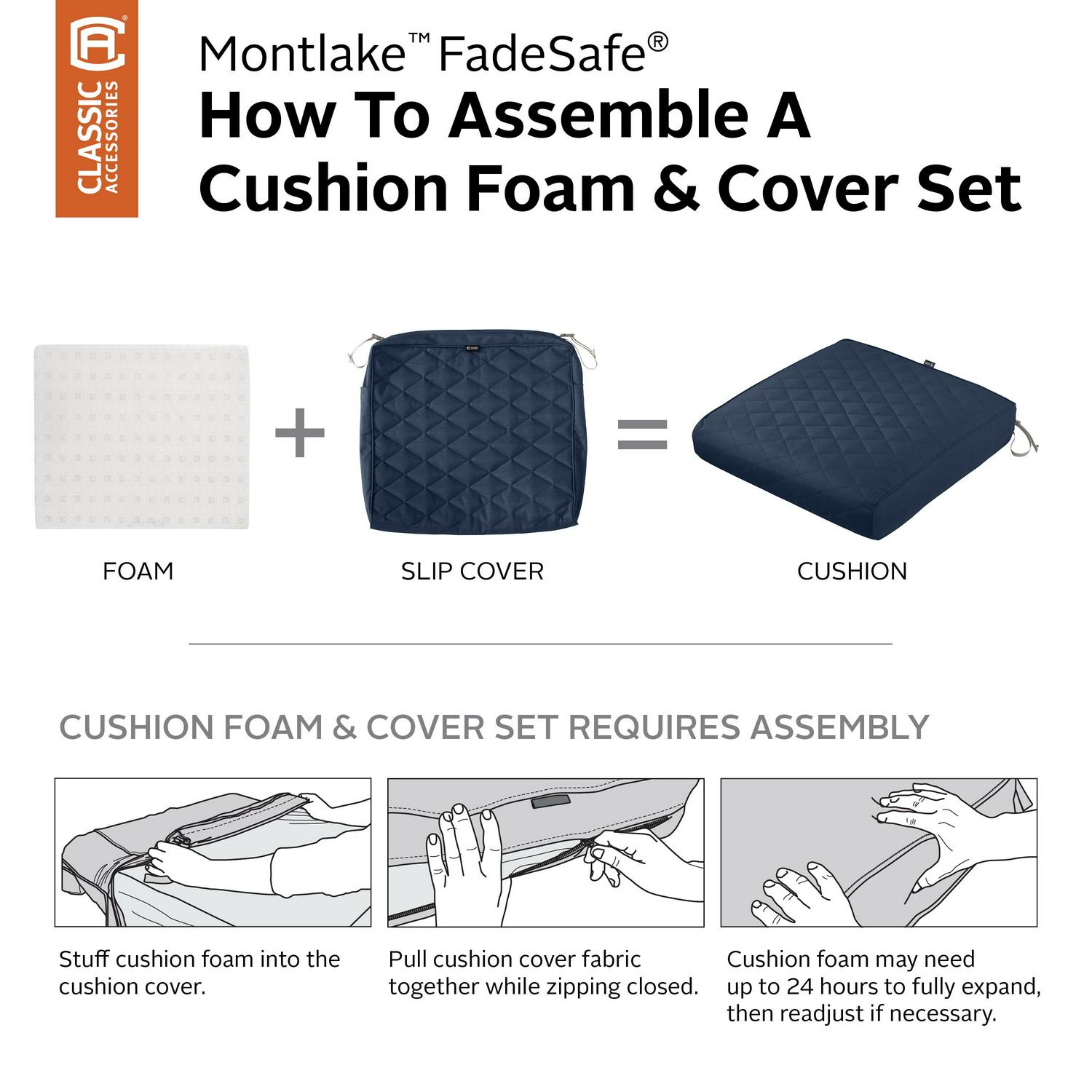 Renew the look and feel of your patio furniture with Montlake FadeSafe Quilted Cushion Covers. See the difference: Montlake FadeSafe fabric makes use of vibrant, coordinating colors in a solution-dyed fabric that revitalizes your patio space immediately. Feel the difference: these designer cushions have a layer of quilted padding, giving a luxurious level of comfort to your seating. With quality materials and features carefully selected by our in-house design team, these cushions promote an inviting atmosphere you can gather to, rely on and relax in. Offered in vibrant colors that coordinate with the rest of the Montlake FadeSafe Outdoor Living Collection, quilted cushion covers are ready to help you explore what your patio can be. Meant to be modern, the Montlake FadeSafe collection aims to refresh the parts of your home where people gather and Discover More Time Outdoors. With our products, we hope to help you have a great time in your yard and home. If you have any questions or concerns, or if your cushion cover fails within the warranty period, look for us online and take advantage of our Hassle-Free warranty program supported by our US-based customer service team.