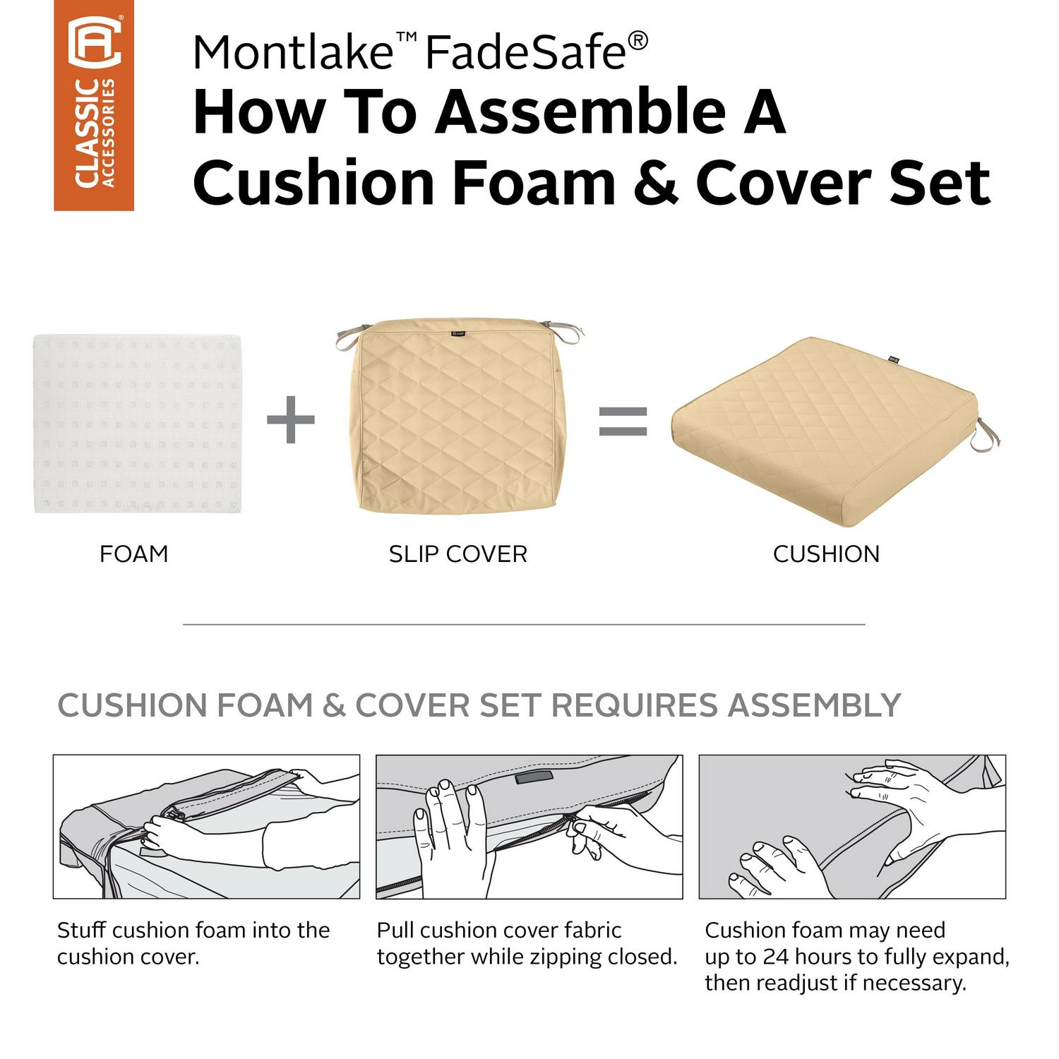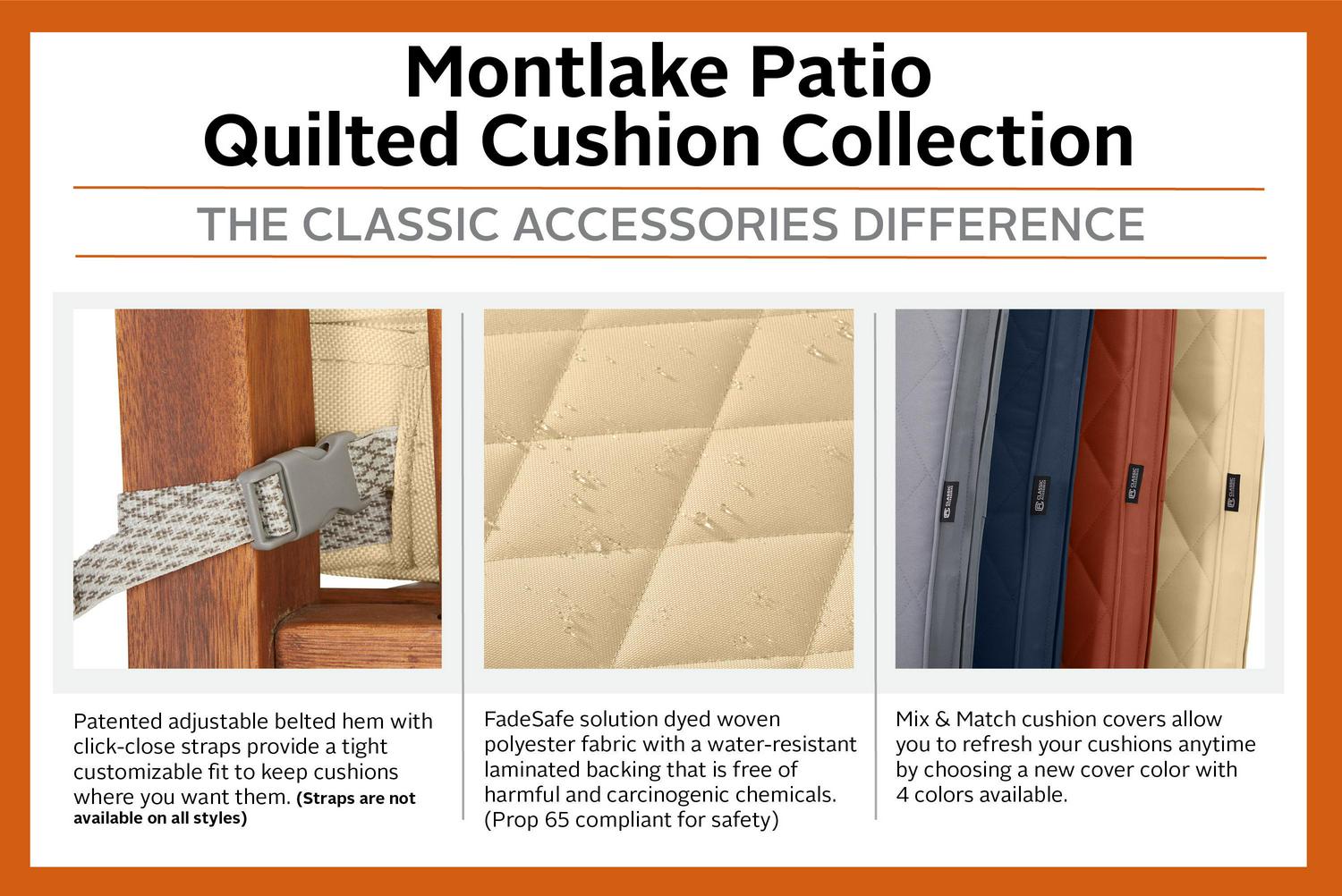 Renew the look and feel of your patio furniture with Montlake FadeSafe Quilted Cushion Covers. See the difference: Montlake FadeSafe fabric makes use of vibrant, coordinating colors in a solution-dyed fabric that revitalizes your patio space immediately. Feel the difference: these designer cushions have a layer of quilted padding, giving a luxurious level of comfort to your seating. With quality materials and features carefully selected by our in-house design team, these cushions promote an inviting atmosphere you can gather to, rely on and relax in. Offered in vibrant colors that coordinate with the rest of the Montlake FadeSafe Outdoor Living Collection, quilted cushion covers are ready to help you explore what your patio can be. Meant to be modern, the Montlake FadeSafe collection aims to refresh the parts of your home where people gather and Discover More Time Outdoors. With our products, we hope to help you have a great time in your yard and home. If you have any questions or concerns, or if your cushion cover fails within the warranty period, look for us online and take advantage of our Hassle-Free warranty program supported by our US-based customer service team.
