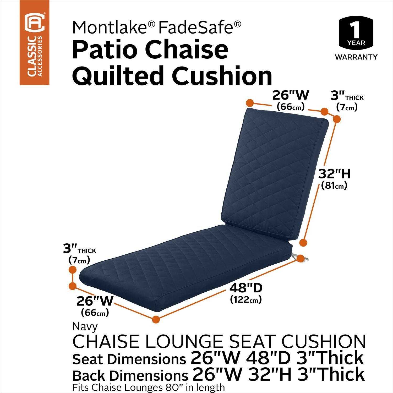Classic Accessories Montlake FadeSafe Water-Resistant Patio Chaise Quilted Cushion, 80 x 26 x 3 inch, Navy