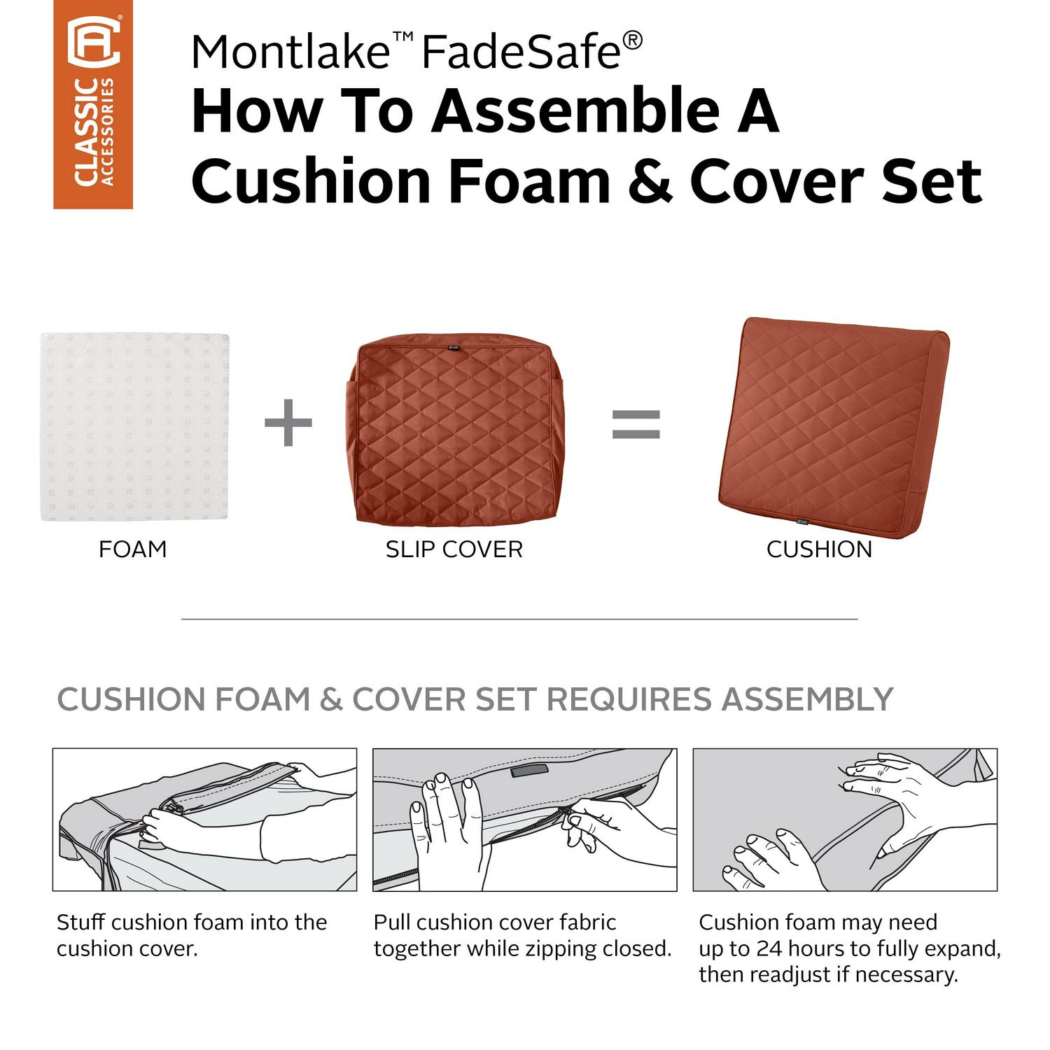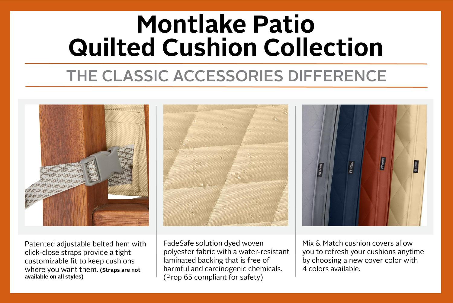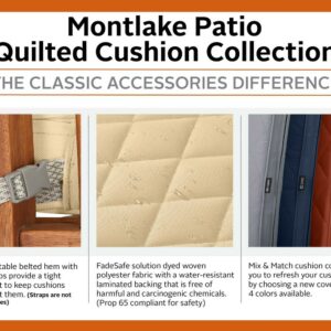 Renew the look and feel of your patio furniture with Montlake FadeSafe Quilted Cushion Covers. See the difference: Montlake FadeSafe fabric makes use of vibrant, coordinating colors in a solution-dyed fabric that revitalizes your patio space immediately. Feel the difference: these designer cushions have a layer of quilted padding, giving a luxurious level of comfort to your seating. With quality materials and features carefully selected by our in-house design team, these cushions promote an inviting atmosphere you can gather to, rely on and relax in. Offered in vibrant colors that coordinate with the rest of the Montlake FadeSafe Outdoor Living Collection, quilted cushion covers are ready to help you explore what your patio can be. Meant to be modern, the Montlake FadeSafe collection aims to refresh the parts of your home where people gather and Discover More Time Outdoors . With our products, we hope to help you have a great time in your yard and home. If you have any questions or concerns, or if your cushion cover fails within the warranty period, look for us online and take advantage of our Hassle-Free warranty program supported by our US-based customer service team.