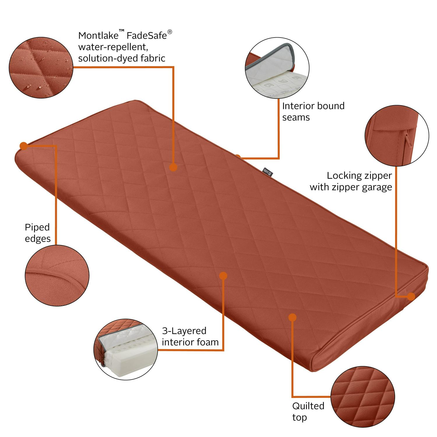Classic Accessories MontlakeA FadeSafeA Rectangle Settee/Bench Seat Quilted Cushion Lounge Cushion, Spice, 42 W x 18 D x 3 H