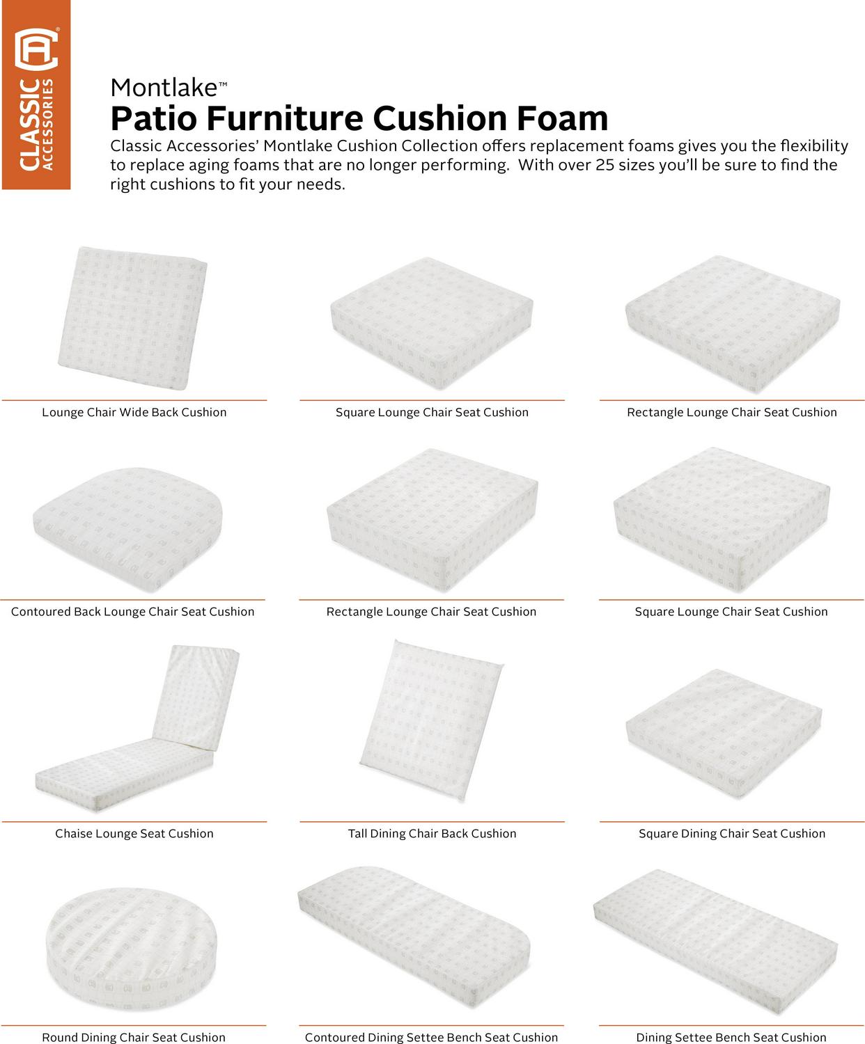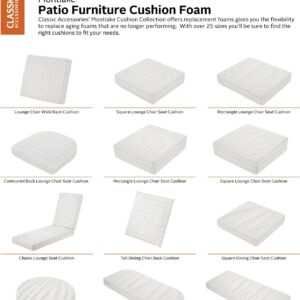 Patio Cushions by Classic Accessories offers replacement foams in 28 sizes giving you the flexibility to replace aging, under performing foams. This high quality foam uses a dense core with a soft outer layer to provide just the right give for a firm but comfortable surface. Available with matching slip covers in 6 colors, these foams can be purchased individually or along with the patio cushion cover to make a full replacement cushion for your patio furniture. When you buy a Classic Accessories patio cushion you are not just getting a cushion; you are also purchasing lasting comfort and peace of mind. Not only will your patio cushions be protected from the elements, but you will be protected with the easiest warranty in the industry. If your patio cushion fails within the warranty period, look for us online and take advantage of our Hassle-Free warranty program supported by our US-based customer service team.