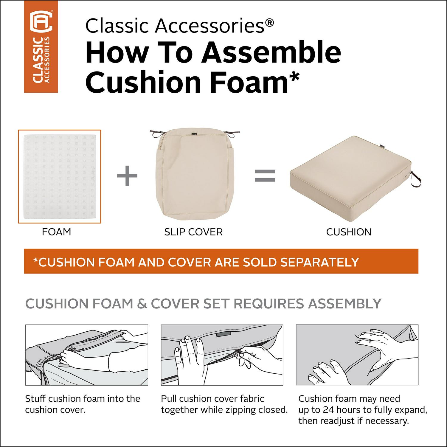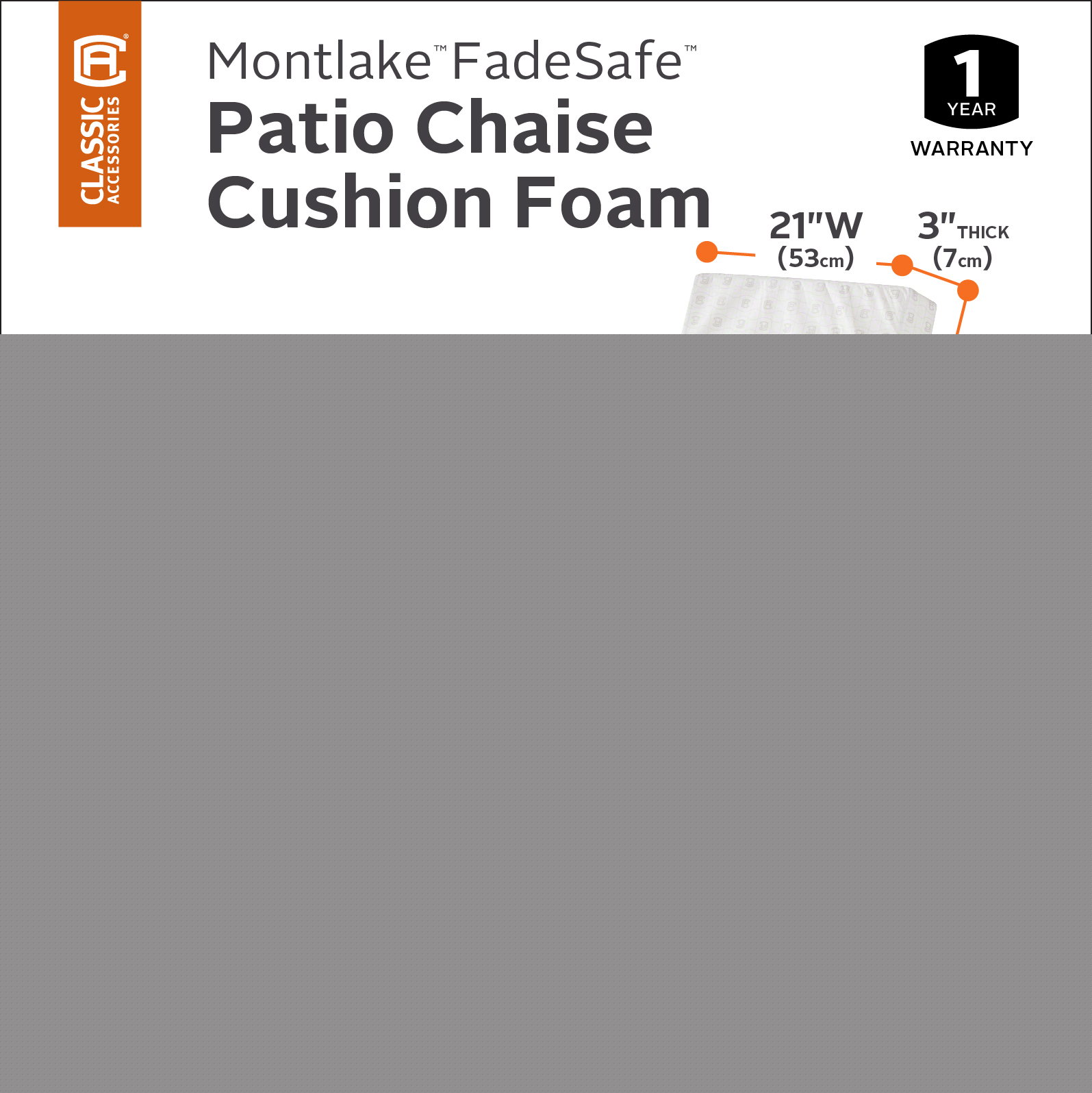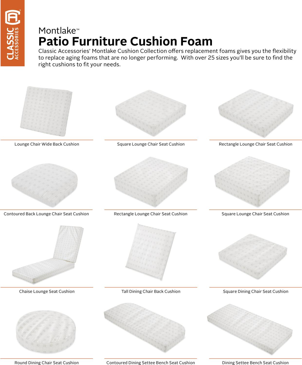The Montlake Patio Cushion Collection by Classic Accessories offers replacement foams in 28 sizes giving you the flexibility to replace aging, under performing foams. This high quality foam uses a dense core with a soft outer layer to provide just the right give for a firm but comfortable surface. Available with matching slip covers in 6 colors, these foams can be purchased individually or along with the patio cushion cover to make a full replacement cushion for your patio furniture. When you buy a Classic Accessories patio cushion you are not just getting a cushion; you are also purchasing lasting comfort and peace of mind. Not only will your patio cushions be protected from the elements, but you will be protected with the easiest warranty in the industry. If your patio cushion fails within the warranty period, look for us online and take advantage of our Hassle-Free warranty program supported by our US-based customer service team.
