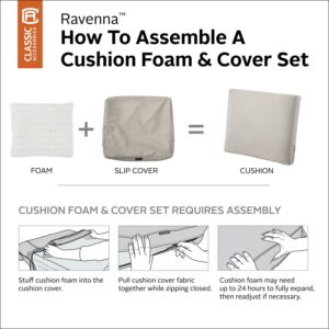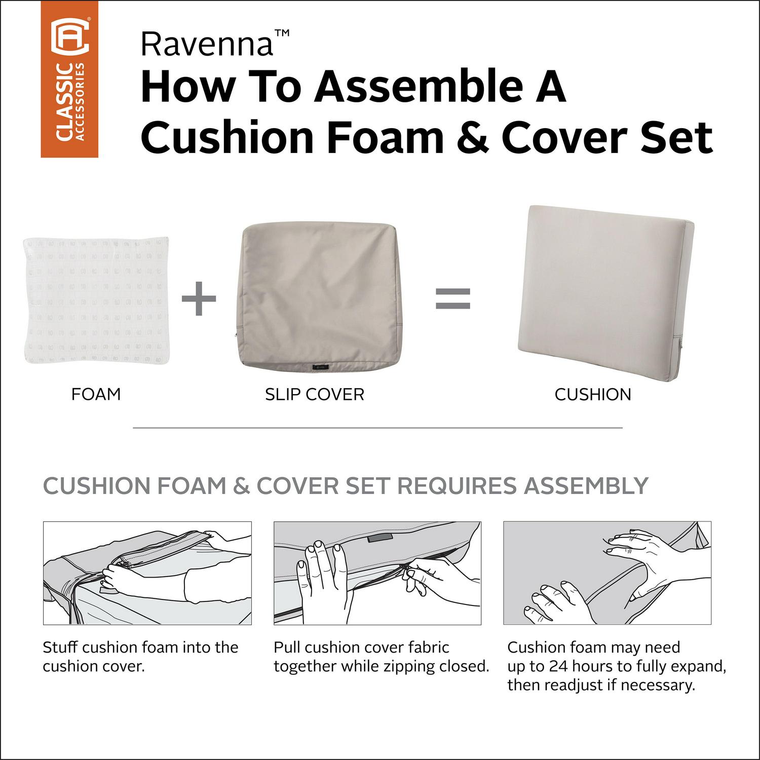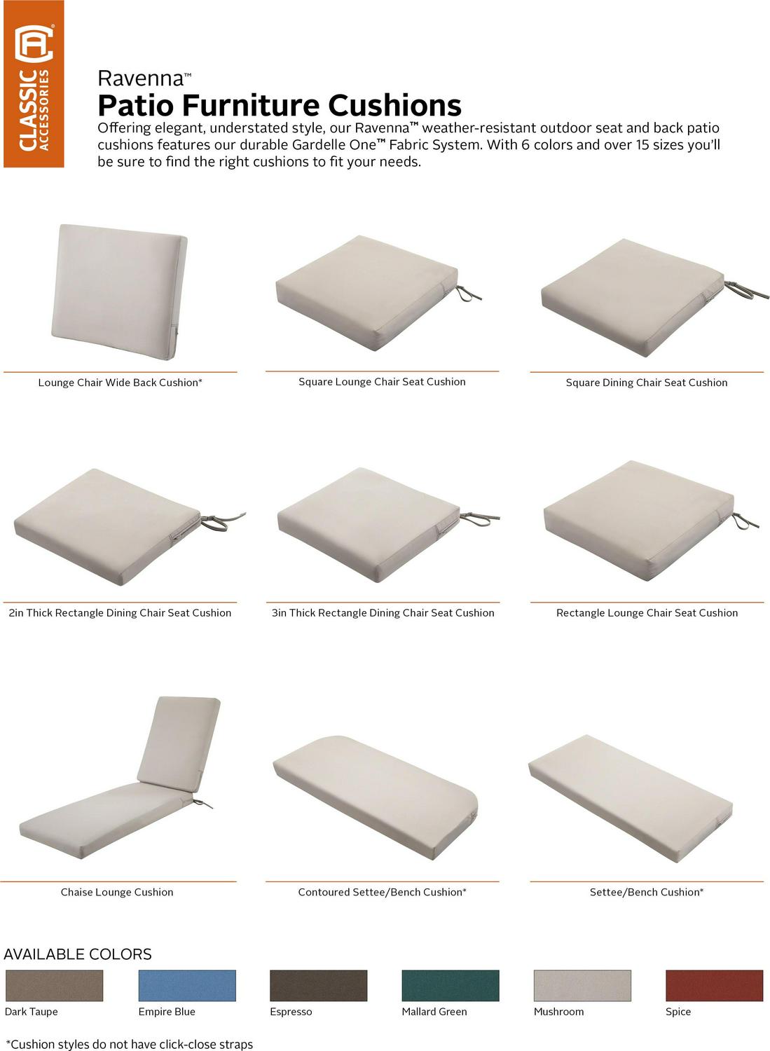 Add comfort to your outdoor furniture with the Ravenna Patio Cushion Collection by Classic Accessories. Made with a solution-dyed polyester, our Gardelle One Fabric System keeps Mother Nature and unforeseen spills at bay with resisting stains and helping keep rain out so your cushion foam stays protected. High-quality foams provide just the right amount of give for a firm but comfortable surface. We offer 6 rich colors designed to stand the test of time and fit a variety of tastes. When you buy a Classic Accessories patio cushion you are not just getting a cushion; you are also purchasing lasting comfort and peace of mind. Not only will your patio cushions be protected from the elements, but you will be protected with the easiest warranty in the industry. If your patio cushion fails within the warranty period, look for us online and take advantage of our Hassle-Free warranty program supported by our US-based customer service team.
