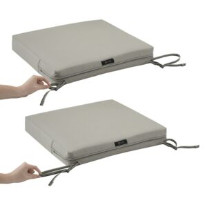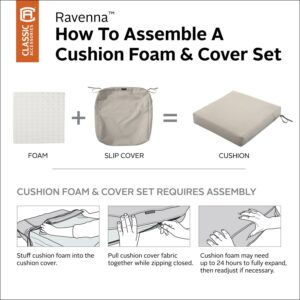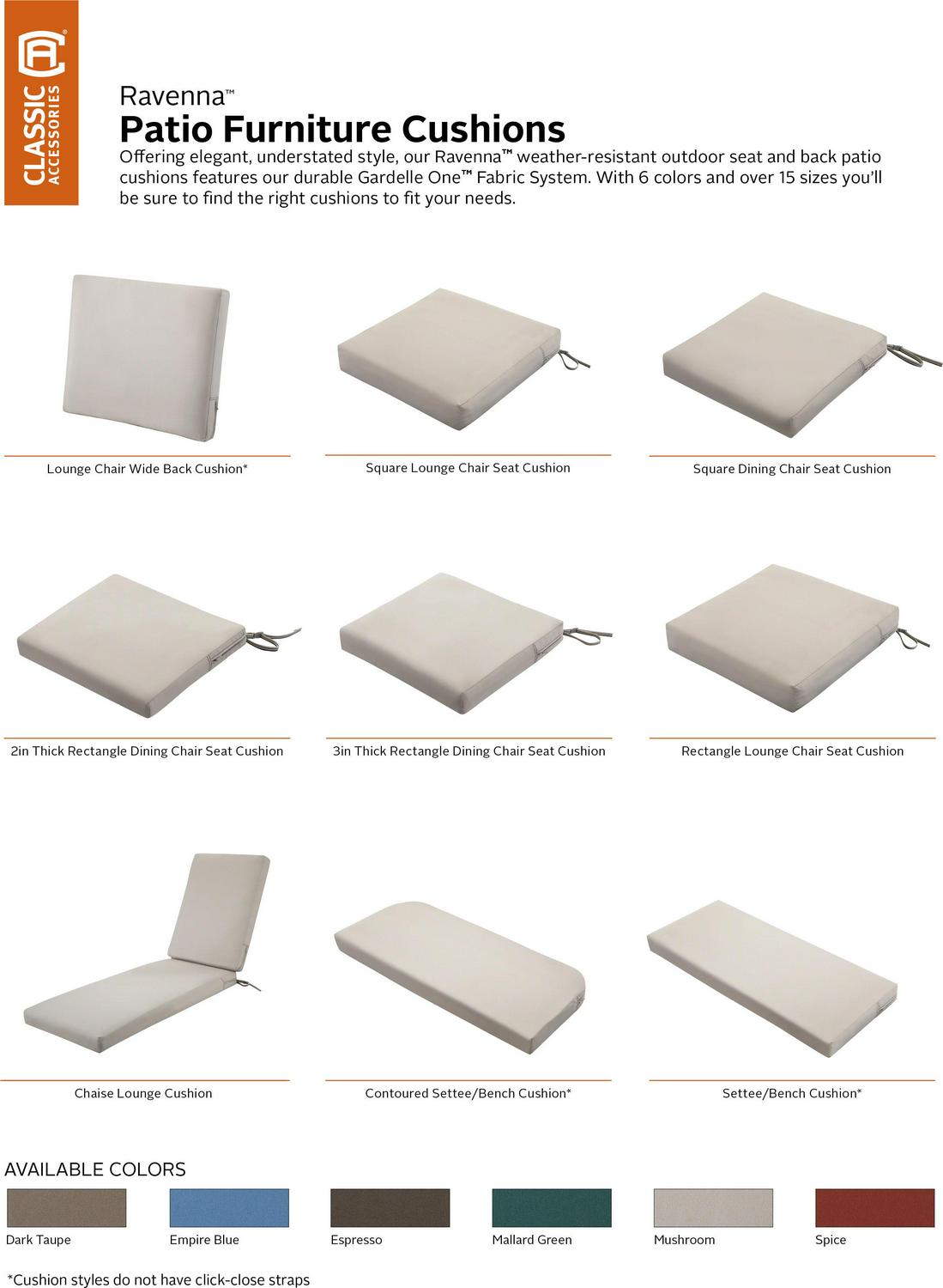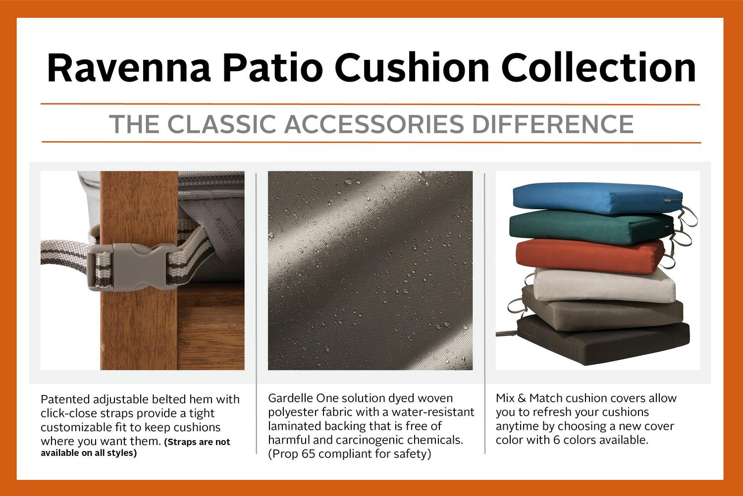 Add comfort to your outdoor furniture with the Ravenna Patio Cushion Collection by Classic Accessories. Made with a solution-dyed polyester, our Gardelle One Fabric System keeps Mother Nature and unforeseen spills at bay with resisting stains and helping keep rain out so your cushion foam stays protected. High-quality foams provide just the right amount of give for a firm but comfortable surface. We offer 6 rich colors designed to stand the test of time and fit a variety of tastes. When you buy a Classic Accessories patio cushion you are not just getting a cushion; you’re also purchasing lasting comfort and peace of mind. Not only will your patio cushions be protected from the elements, but you’ll be protected with the easiest warranty in the industry. If your patio cushion fails within the warranty period, look for us online and take advantage of our Hassle-Free warranty program supported by our US-based customer service team.