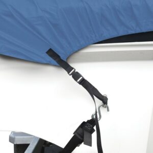 – PROTECTIVE COVER FOR BOATS: Elastic cord gives a tight, custom fit while the integrated buckle and strap system allows for easy fitting and trailering, adjustable straps snap into quick-release buckles on the cover