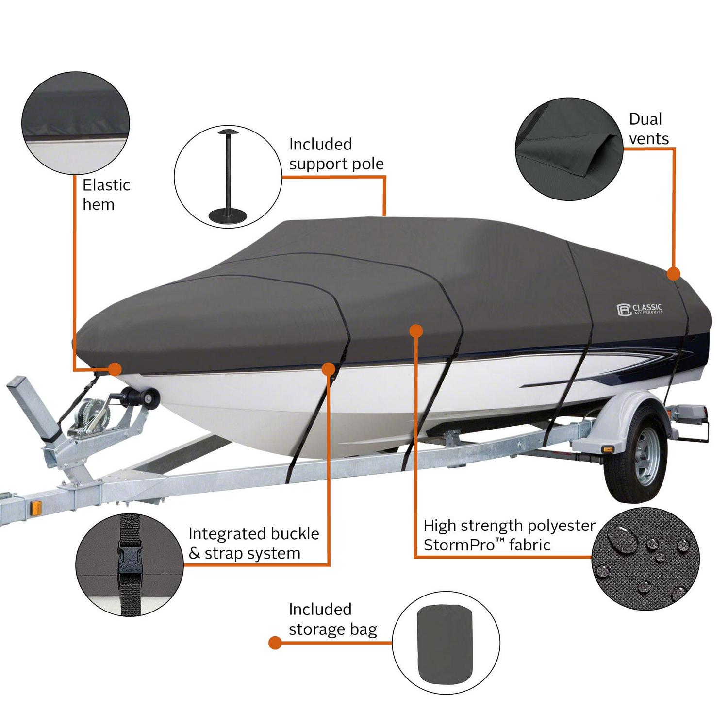 The StormPro Trailerable Boat Cover by Classic Accessories provides a heavy-duty cover designed for both long-term storage and highway travel. When you buy a Classic Accessories boat cover you are not just getting a cover; you re also purchasing peace of mind. Not only will your boat be protected from the elements, but you ll be protected with the easiest warranty in the industry. If your product fails within the warranty period, look for us online and take advantage of our Hassle-Free warranty program supported by our US-based customer service team.