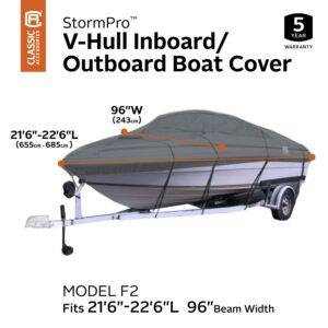 Classic Accessories StormPro Heavy-Duty V-Hull Inboard/Outboard Boat Cover, Fits boats 21 ft 6 in – 22 ft 6 in long x 96 in wide