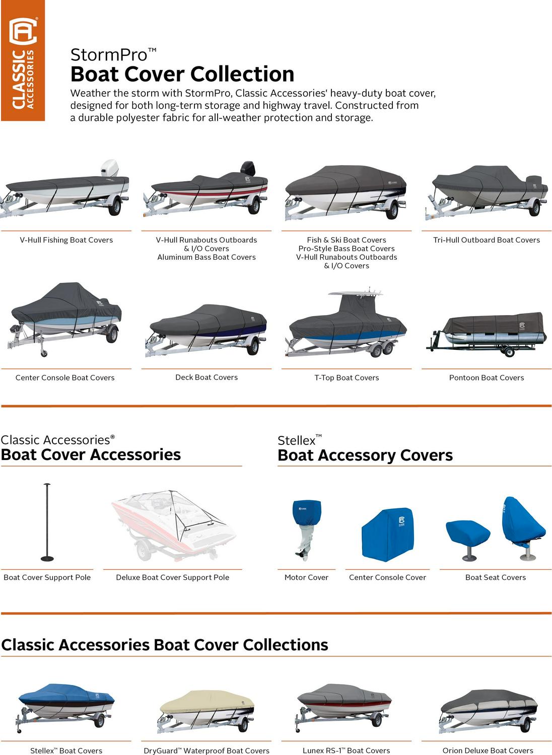 The StormPro T-Top Boat Cover by Classic Accessories provides a heavy-duty cover designed for long-term storage. When you buy a Classic Accessories boat cover you are not just getting a cover; you re also purchasing peace of mind. Not only will your boat be protected from the elements, but you ll be protected with the easiest in the industry.