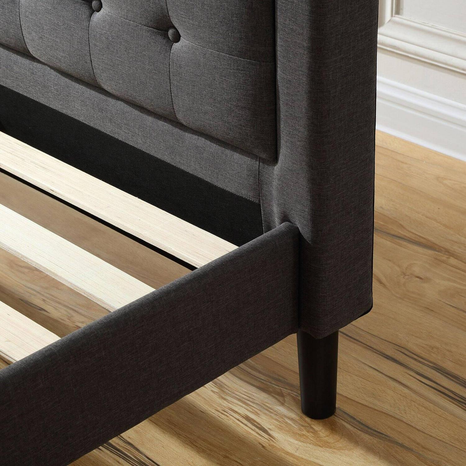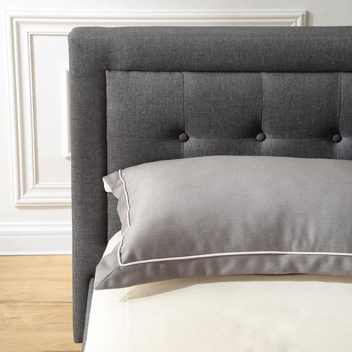 - Soft-to-the-touch button-tufted upholstery on headboard and rails