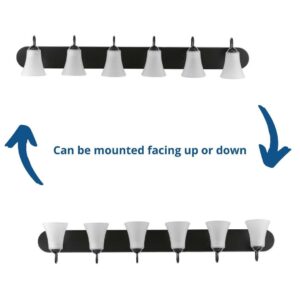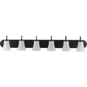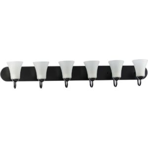Make a gorgeous, striking impact with the Classic six-light bath. A bold Black backplate serves as a supporting act to the main cast of bell-shaped, etched glass shades accompanied by sleek, curved arms. This epitome of perfection is ideal for bathrooms, dining rooms, or wherever focused task light is desired in transitional settings.