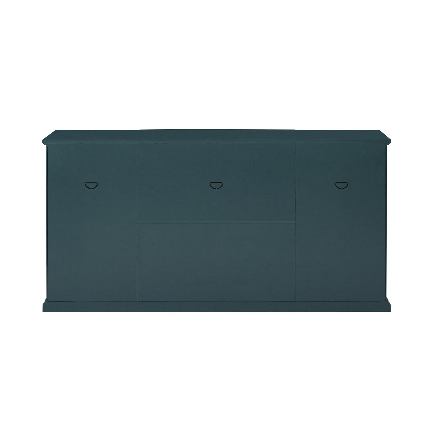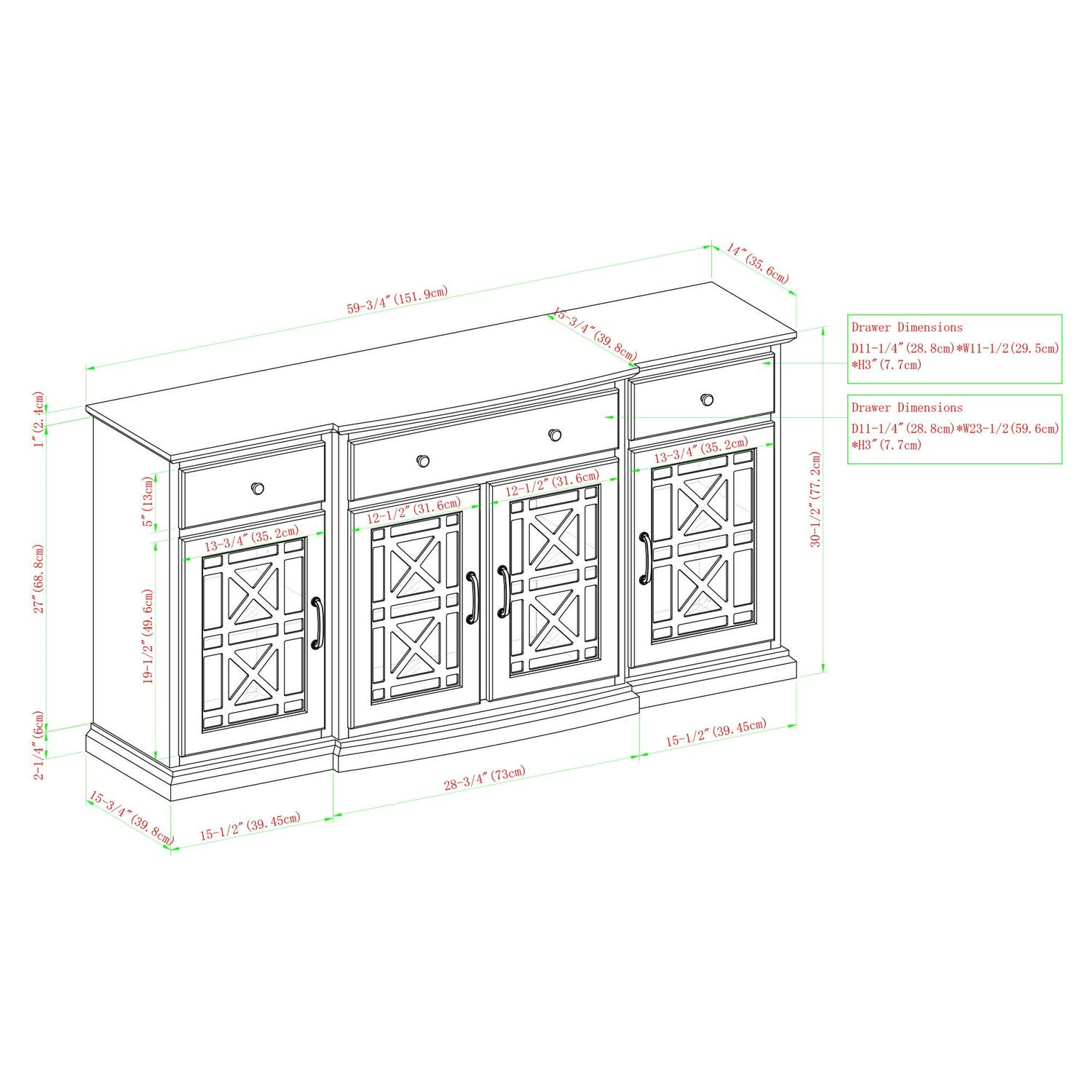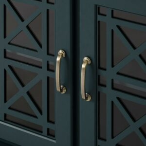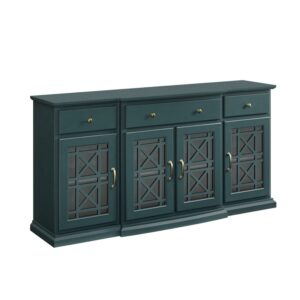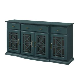 Bring the Runswick Fretwork Sideboard in Dark Teal by Birch Harbor into your dining room or living room for a classic look and extra storage space. The four fretwork doors with glass panes and curved tiered design bring a traditional aesthetic that elevates any home decor. With three drawers on telescoping metal glides and four adjustable shelves, this storage console can fit in the kitchen to hold utensils and pans or in the office for your books and office supplies. Accommodates TVs up to 65 inches.