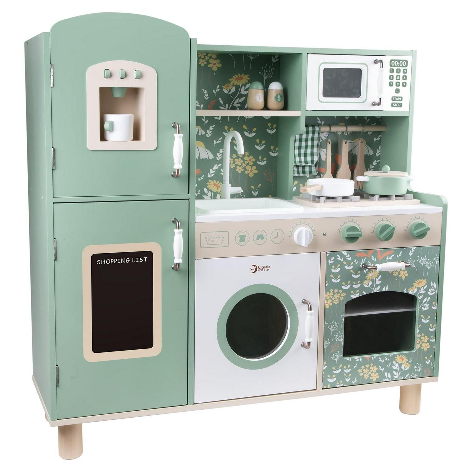 The Classic World wooden Vintage play kitchen is predominantly green with lovely floral patterns. A classical retro style for children to enjoy. The Toy Kitchen set includes many functional areas such as sink, stove, cupboards and dishwasher plus more. Children can write down the ingredients they need to get prepared, or simulate the action of cooking on the stove. They will gain an amazing cooking experience. Easy assembly required. The 50560 Vintage Coffee Maker pairs well with this item. This is a Great Birthday or Holiday Gift Item for any Child Ages 3 Years and up.
