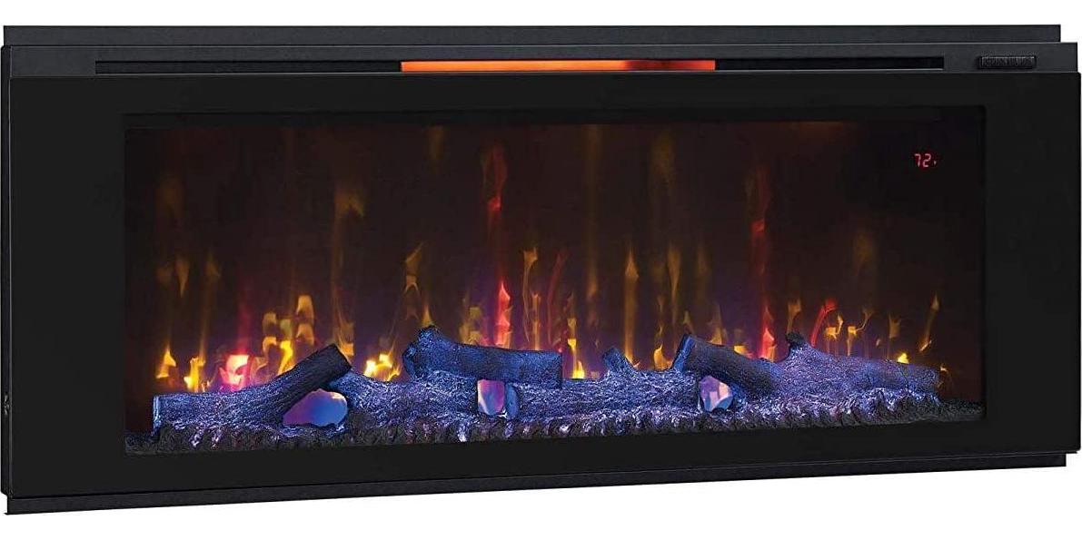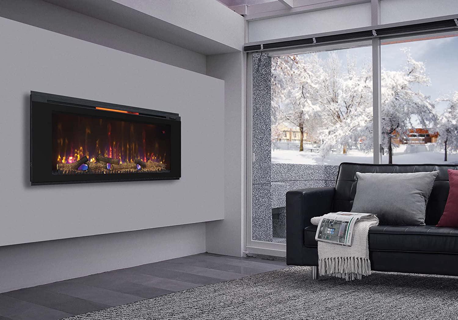 Add character and warmth to your room with the Helen 48-In Wall Mount Electric Fireplace. This modern linear fireplace has the option of two installation methods. Choose to hang the unit directly on the wall like a picture or build it into a wall for a recessed appearance. Select from three blue and three orange flame effect colors to create various looks for your room. The fireplace also features uplighting, which allows you to add amber and/or blue accents within the firebox. The unit also comes with 3 ember media options: Logs, Glass or Rocks. The Helen 48″ features an integrated heater that heats spaces up to 400 square feet. with supplemental heat. An easy-to-set digital thermostat makes it simple to maintain the desired room temperature. This fireplace stays cool to the touch and is safe for use around children and pets. The included multi-function remote controls the flames, timer, and uplights.
