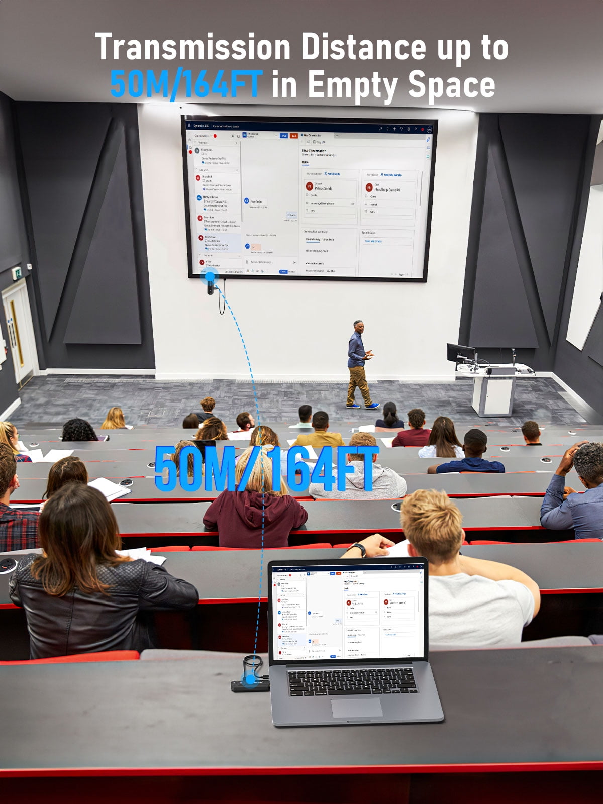 HDMI Transmitter and Receiver allows you to transmit and extend signals up to 50 meters (164 feet) wirelessly. It has strong anti-interference capability by operating at a frequency of 5 GHz and supports point-to-point connection. Transmitter End: Material : ABS Interface Introduction: 1 * HDMI Male, 1*Type C Color: Black Chip: AM8270 Power supply: 5V 2A Resolution: 1080P 60HZ Memory : 1Gbit DDR3 Weight : 60g Transmission distance: 50M Receiver End: Model: P20 TX RX Material: aluminum alloy Interface Introduction: 1 * HDMI Male Color Space: Black Chip: AM8272 Power supply: 5V 2A Memory: 1Gbit Resolution Max: 1080P 60HZ Memory: 1Gbit