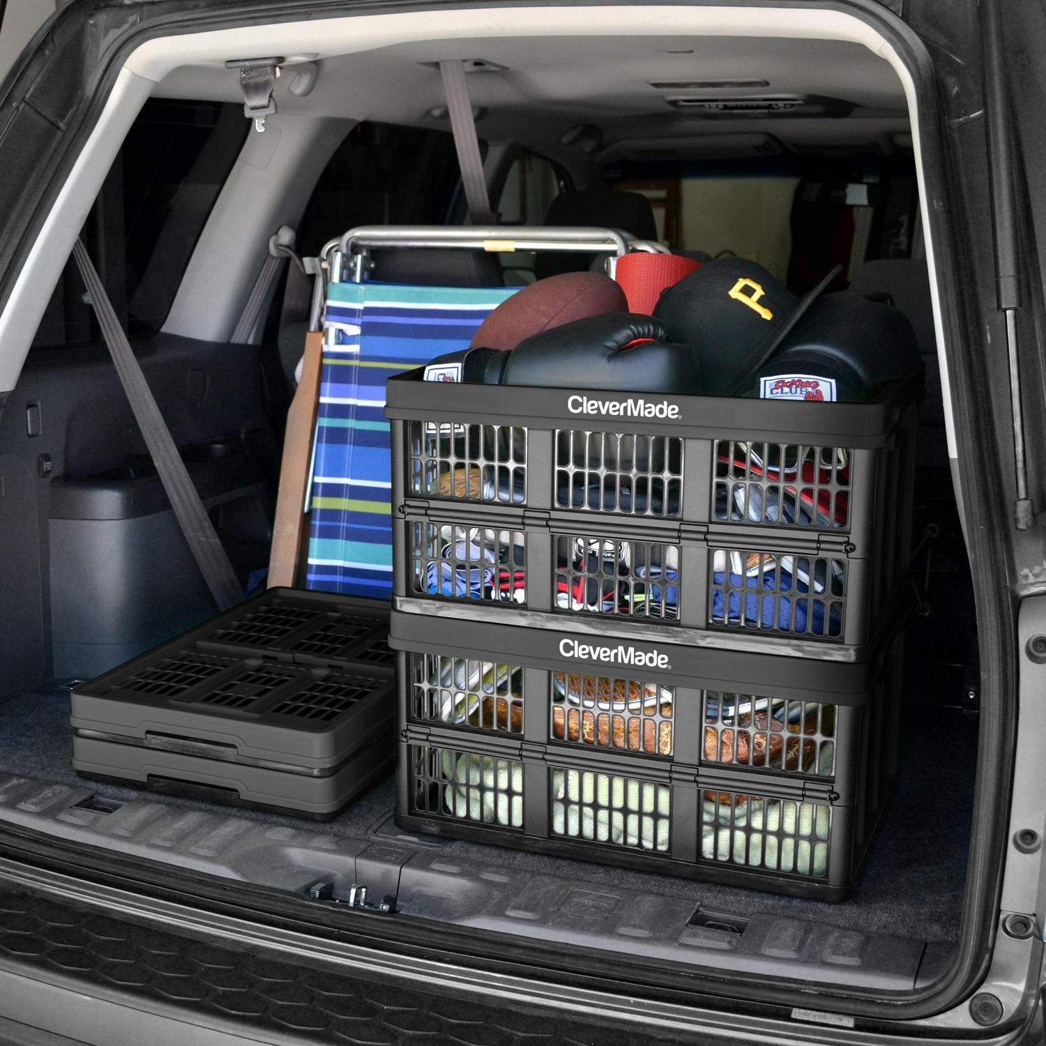 CleverMade Collapsible Grated Utility Crates are durable, lightweight, and offer streamlined storage at home or on-the-go. These crates are the perfect organizer for decluttering any space in the home or car. Once open, the crates lock into position making them ideal for stacking or on-the-go transport. Keep the crates collapsed in the trunk of your car and pop open for grocery shopping. The sturdy bins stay structured meaning no more spilled groceries all over the trunk! Use the handy bins to organize the garage and keep all your items tidy and ready to go when you need them. The perfect solution for any adult hauling up to 66 lbs. of gear, sporting equipment or groceries. The grated sides allow for airflow and visibility into the crate so you can easily find what you’re looking for. These utility crates make storing and transporting a breeze. They are easy to clean simply by wiping down with a wet towel or hosing off and then letting them air dry. The best part CleverMade Crates fold flat and nest together making them a super space-saver and easy to store just about anywhere.