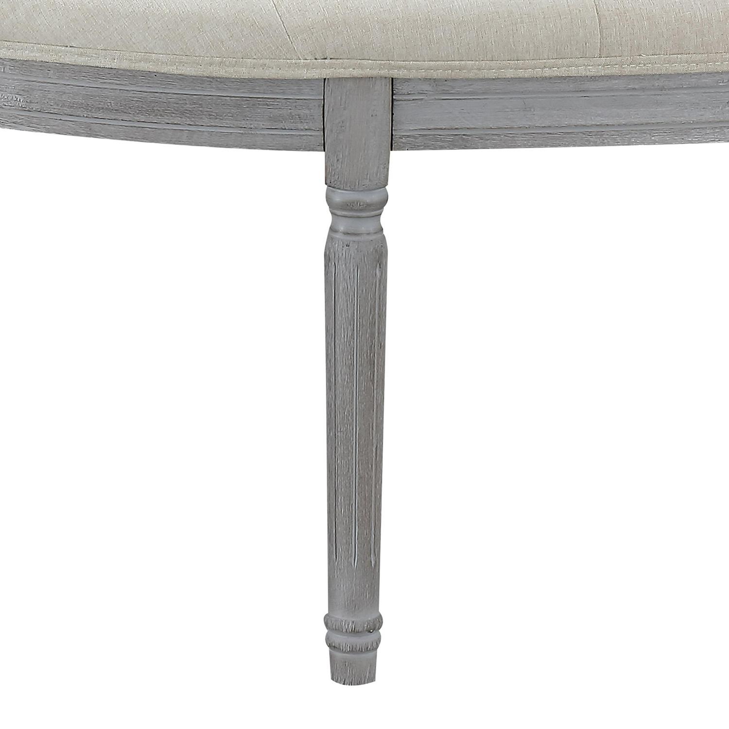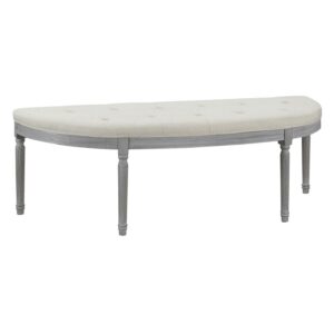 Take your boring room and create something amazing with our fabric and wood bench. Created with much thought, it has been designed to fit flush against any flat wall, maximizing space utilization and livening up any room. The soft linen-like fabric, well built construction, and weathed gray wooden legs showcase both its finess and beauty. This gorgeously crafted half crecent button tufted bedroom bench would be an excellent addition at the end of your bed, in your foyer, or in any entrance cooridor. Show off your great taste and sense of fashion today.