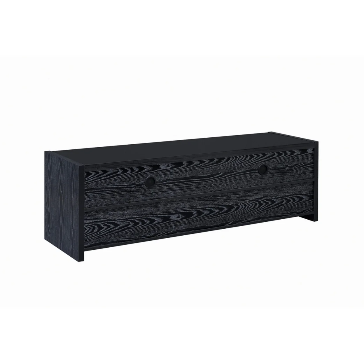 TV console finished in black oak Constructed with MDF, particle board, and laminate Features two (2) storage compartments and three (3) storage drawers Euro drawer glides Finish: Black oak Max TV size: 65″; Max TV weight: 88 lbs. Assembly type: RTA Hardware finish: Silver Assembly required: Yes