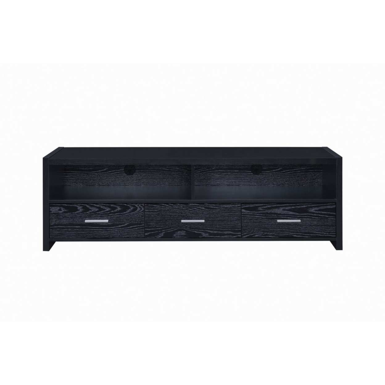 Sleek and modern, this TV console is a stylish choice. Exquisitely crafted from black oak, it boasts a classy, contemporary appeal that looks lovely in a den or family room. Brushed silver hardware creates a striking contrast to its bold, black finish. Three large drawers and two spacious compartments offer plenty of storage for electronics, games, movies, and more. Whether you’re gathering loved ones for movie night or enjoying a gaming marathon, this console provides hours upon hours of entertainment. Features: Includes: One (1) TV console Finish: Black Oak Hardware finish: Silver Materials: MDF, Metal, Particle Board, Hollow Board, Engineered Veneer Features two (2) storage compartments and three (3) storage drawers Euro drawer glides Drawer Construction: Front cam bolt with nut and back screw construction Leveler/plastic glide: Plastic glide Max TV size: 65″ Max TV weight: 88 lbs Number of compartments: 6 Hardware type: Pull handle Leveler/ plastic glide: Plastic glide Specifications: Product Dimensions: 19.75″H x 61.25″W x 17.75″D Product Weight: 105.6 lbs Number of Shelves: 2 Number of Drawers: 3 Assembly Required: Yes Warranty: One (1) year limited manufacturer warranty