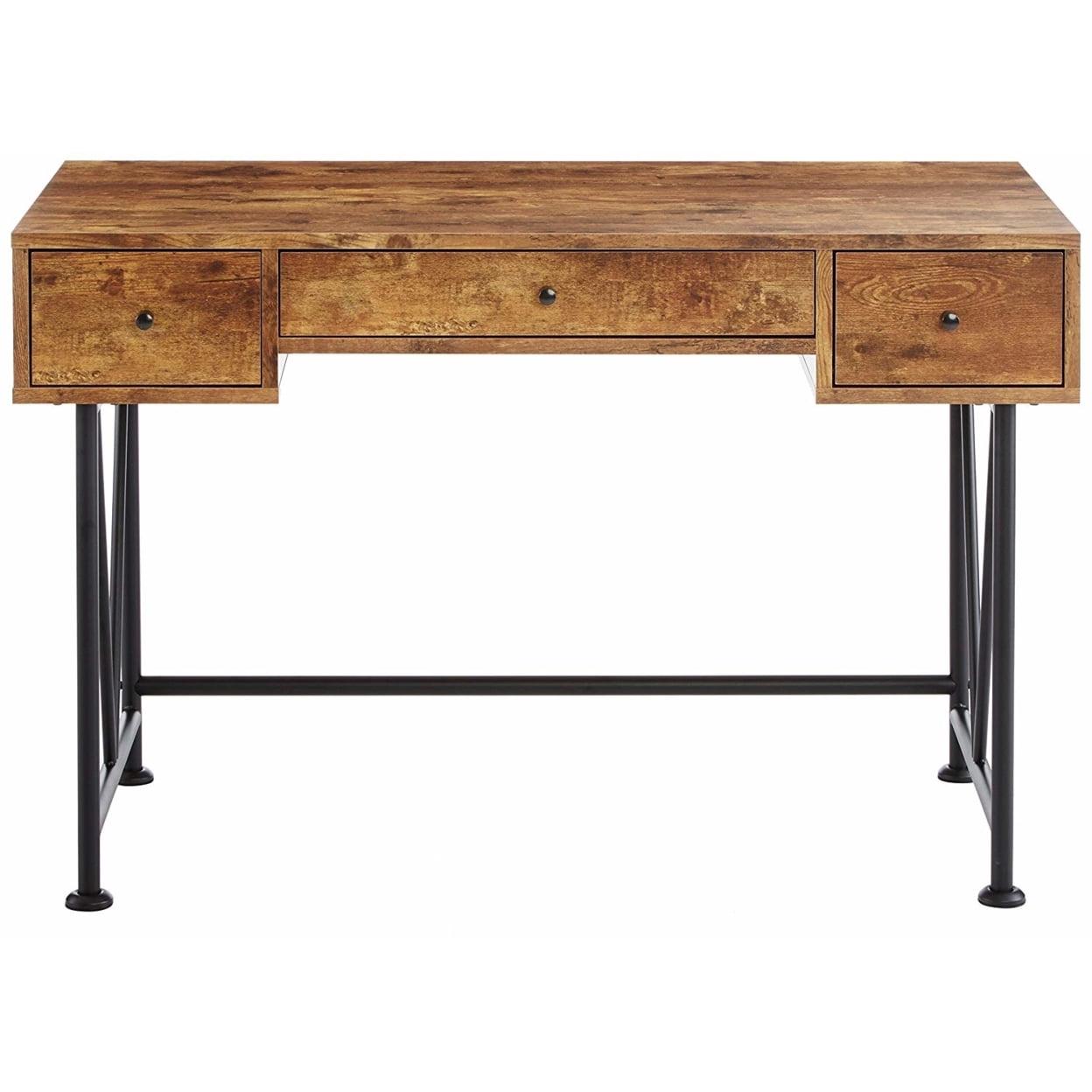 - Industrial home office writing desk with an antique nutmeg finish and black metal frame