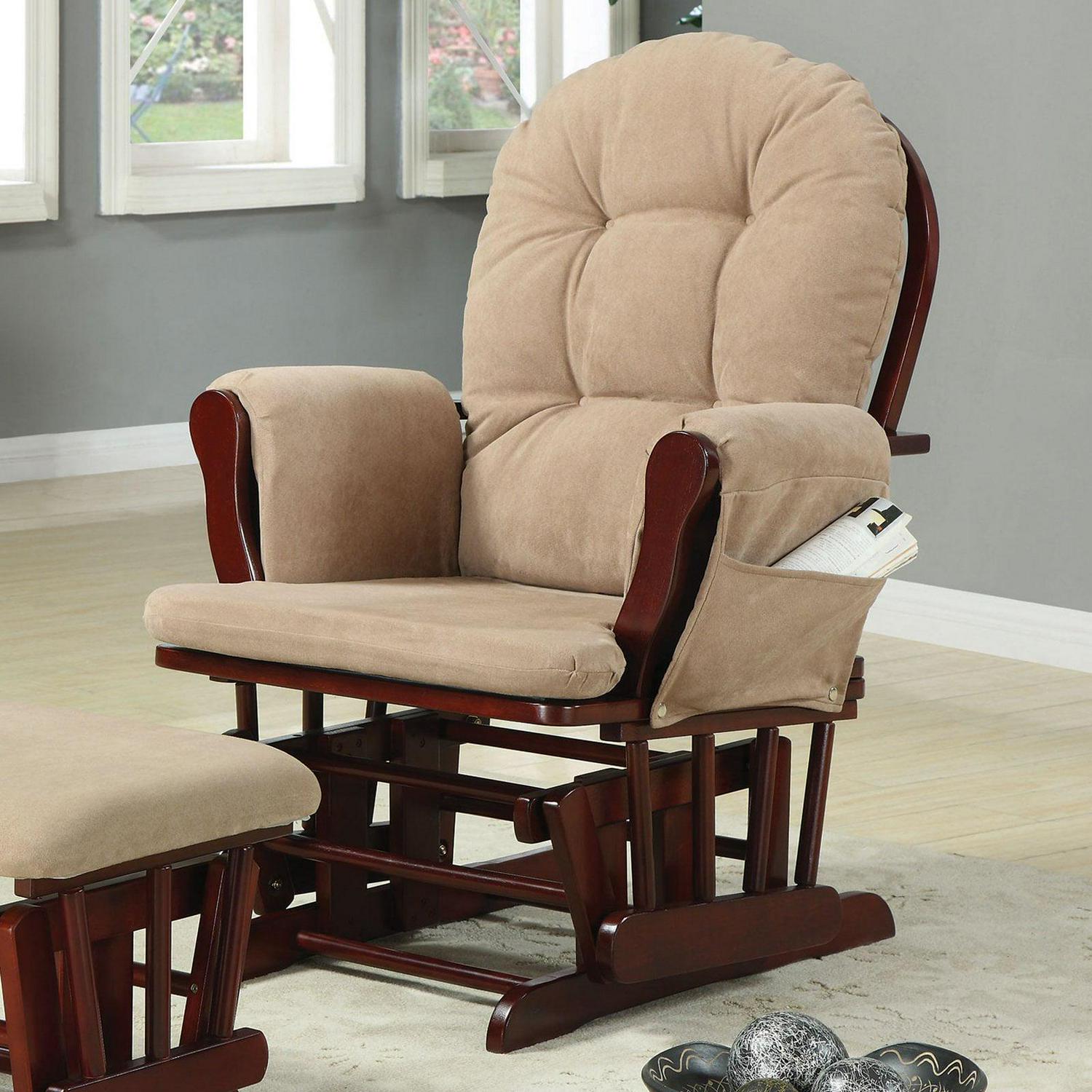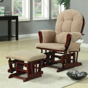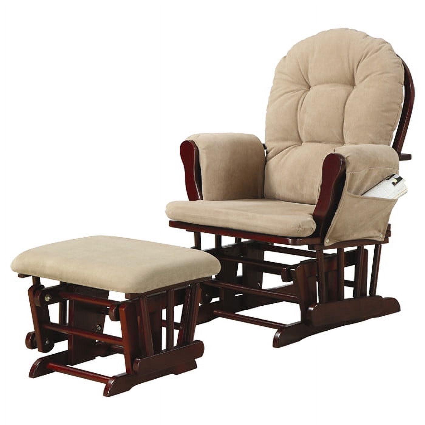 – Luxurious transitional glider chair and ottoman set features classic comfort and an updated design Glider features plush elegant tan microfiber upholstery Flared arms for convenience and comfort Wood glider frame crafted in charming cherry finish Sturdily fashioned with plywood and rubberwood Matching glider ottoman included
