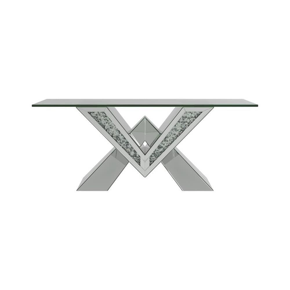 Includes: One (1) coffee table Contemporary style occasional set with gleaming, mirror lined surfaces Bold “V” motif with sparkling encrusted crystals Elegant beveled tempered glass table top