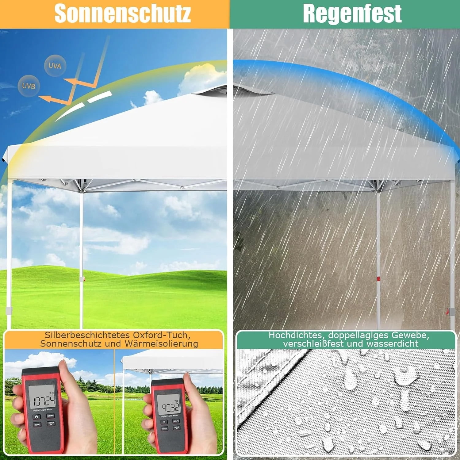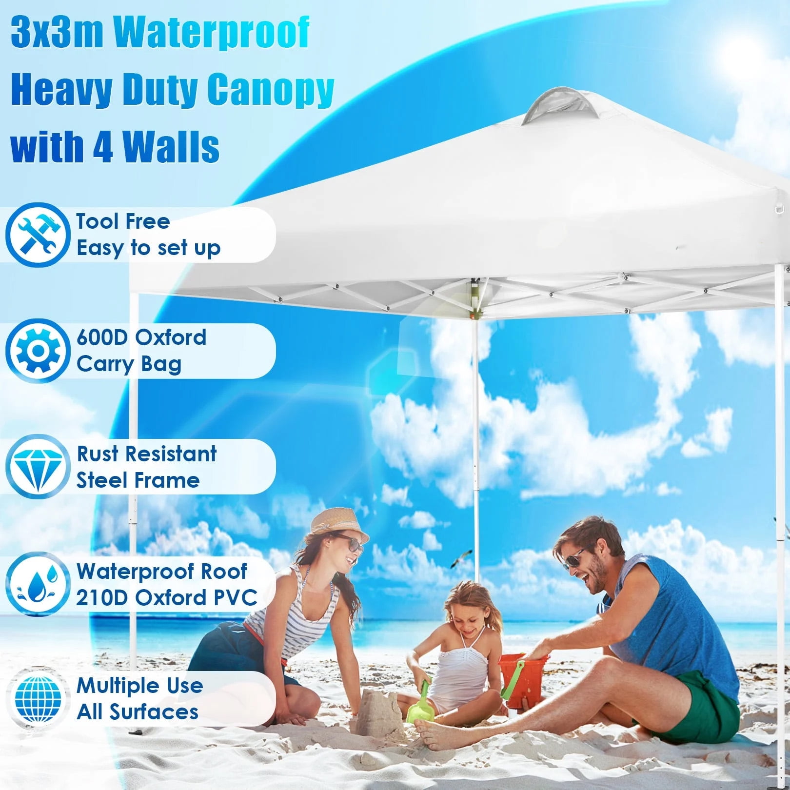 Our COBIZI 10×10 EZ pop up canopy ,you can easy set up by 2 people. 4 sidewalls include 2 zippers and 2 windows,which makes you away from the rain,sun and wind.Multifunctional 10×10 canopy design allows you to use it for outdoor events anywhere,including parties,camping,backyard,beach,family gathering and garden.