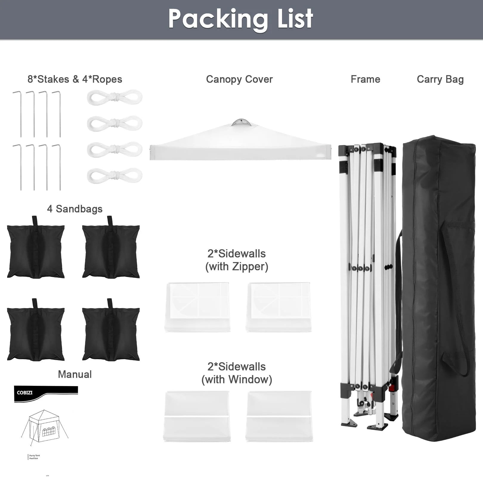 Key Features: 【Easy Set up &Take Down】No tools required.The COBIZI 10×10 pop up canopy for outside is designed for convenience. All the parts are already assembled, so you don’t have to worry about missing pieces or searching for tools. Whether you’re setting up for a party or taking it down after an event, our 10×10 canopy makes the process quick and effortless. 【Complete accessories】10x10ft Pop Up Canopy Tent Frame + 10x10ft Canopy Top Cover + 4xSidewalls + 4xSandbags + 600D Oxford Fabric Bag + 8xStakes + 4xRopes + Manual.Includes all necessary accessories, no need to purchase additional items, saving you time and effort, so you can immediately enjoy the convenience and functionality of the canopy. 【Multifunctional Use】10×10 portable commercial camping canopy is suitable for outdoor events, camping, backyard,garden,parties, wedding, picnic, BBQ, and other event uses. Just put party tent into the carry bag and you can quickly set it up anytime, anywhere, whether for leisure or business purposes. 【Air vent】10×10 outdoor canopy with sidewalls has a vent on the top, which helps air circulation inside the canopy. And the top is coated with silver to lower the temperature inside pop up gazebo in hot summer. 【Waterproof & Stable】 10×10 pop up canopy 10×10 made of thicker steel anti-rust coating frame, matched with 210D silver-plated waterproof Oxford cloth, which is waterproof up to 1500pa and provides UPF 50+ UV protection, outdoor canopy suitable for both sunny and rainy days. Canopy Details Brand: COBIZI Weight:33Ib Anti-uv: UPF50+ Water pressure: 1000 Pa Canopy Type: 10×10 Pop-up canopy Color:Black/White/Gray/Blue/Dark Blue/Khaki 3 Height Adjustment: 8.1/8.3/8.5ft Product Dimensions:120″L x 120″W x 102″H Frame Material:210D silver coated oxford fabric;Alloy Steel More Details About Frame: The 10×10 pop up canopy tent is made of a sturdy alloy steel frame and powder coated, resistant to rust, corrosion, chipping and peeling. About Fabric: The 210D silver coated oxford fabric can withstand waterproof pressure up to 2000mm+, waterproof, Anti-UV. About carry size: Easy to store and carry, suitable for most cars. Makes it easier to access the beach, party or park. About sidewall: 4 sidewalls include 2 zipper and 2 window, you can use them all or just a few at a time, as you needs. About seam: The seams of the 10×10ft gazebo are all sealed with seams to make our canopy more waterproof. Package List 10x10ft Pop Up Canopy Frame x1 10x10ft Canopy Top Cover x1 600D Oxford Fabric Bag x1 4 Sidewalls x1 4 Sandbags x1 8xStakes x1 4xRopes x1 Manual x1 Attention: Make sure that the height of your feet is the same when spreading. Fixing the 10x10canopy with nails and rope weights can make the canopy more stable. We suggest not set up the canopy in strong wind or sever weather. If you need any helps, we will try our best to provide a perfect solution.