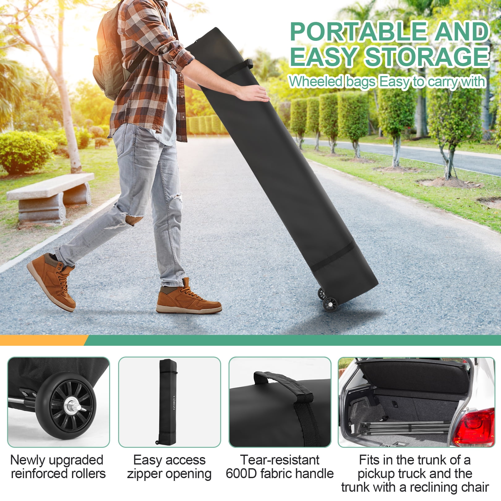 【Heavy Duty Alloy Steel Frame】The upgraded 10×10 commercial pop up canopy tent frame can hold up to 220 lbs (100 kg) on a single pole. The frame can hang 5 adults at the same time! Can withstand 4 winds.(<18 mph). 10×10 party tent with an upgraded alloy steel full truss structure, and reinforced plastic parts at the stress points at the intersection of the peaks and poles. 10×10 heavy duty canopy frame with powder coated coating guarantees rust resistance and corrosion resistance. 【4 Removable Sidewalls】The 4 canopy side walls with PU coating are connected to the top of the frame and the legs by a whole piece of velcro for fixing, and are detachable, 10 x 10 canopy tent heavy duty can install any number of side walls, which is convenient and practical. When in use, always secure the 10×10 pop up tent with the included stakes and ropes to avoid damage. One year after-sale protection for canopy frame; Six months after-sale protection for fabrics and accessories. 【300D PU Oxford Cloth】Heavy duty canopy tent 10×10 is made of 300D Oxford cloth with two layers of PU coating, UPF 50+, which blocks 99% of UV rays. Waterproof canopy gazebo tent with waterproof strip adopts heat-sealed seam technology, 100% waterproof, 1500mm waterproof pressure. Wedding tent professionally protects you from sun, wind and rain. Tents for parties is perfect for playground, yard, beaches, farm, gym, barbecue, trade shows, sporting event, disaster relief or other outdoor events. 【3 Height Settings】10×10 pop up party tent straight leg has 3 height settings. Thumb latch lock system easy to lock and release, raise the pop up tent to a desired height. Canopy tent 10×10 straight leg height options: 214cm/84.3inch, 223cm/87.8inch, 232cm/91.3inch. Corresponding party tent center height options: 310cm/122.0inch, 319cm/125.6inch, 328cm/129.1inch. 10×10 canopy with sidewalls perfect for commercial activities, camping, festivals, tailgating, backyard events and etc.. 【Wheeled Storage Bag】10×10 pop up canopy wheeled roller bag size is 160x25x24cm (63.0×9.8×9.4inch), 600D Oxford Cloth fabric. Wheeled storage bag with 2 wheels on the bottom for easy transport. 2 handle on the side for 2 people to lift. The Package Includes: Pop up Canopy Frame x 1Pcs + 10′x10′ Canopy Tent Top Cover x 1Pcs + Sidewall with Zipper x 1Pcs + Sidewall with Window x 3Pcs + Sandbag x 4Pcs + Ground Nails x 8Pcs + Ropes x 4Pcs + Wheeled Storage Bag x 1Pcs. Specifications: Color: White/Blue/Black/Gray/Khaki/Dark Blue Type: Heavy Duty Pop-up straight leg canopy Material: 300D Oxford fabric with PU coating (UPF 50+) Top Framework: Center full truss structure Frame Material: Powder Coated Stainless Steel Style: One-Push Pop Up Fold Size: 9.8 x 9.5 x 63 inch Weight: 62 lbs(28kg) Stake Size: 23cm x 5.5mm Adjustable Height (Center Height): 10 -10.5 FT Max Dimensions: 10 x 10 x 10.5 FT Package List: 1 x 10'x10' Canopy Steel Frame 1 x 10'x10' Canopy Top Cover (100% Waterproof) 3 x Tent Sidewall with PVC Window 1 x Tent Sidewall with Zipper 8 x Stakes 4 x Ropes 4 x Sandbags 1 x 600D Oxford Fabric Roller Bag 1 x User Manual