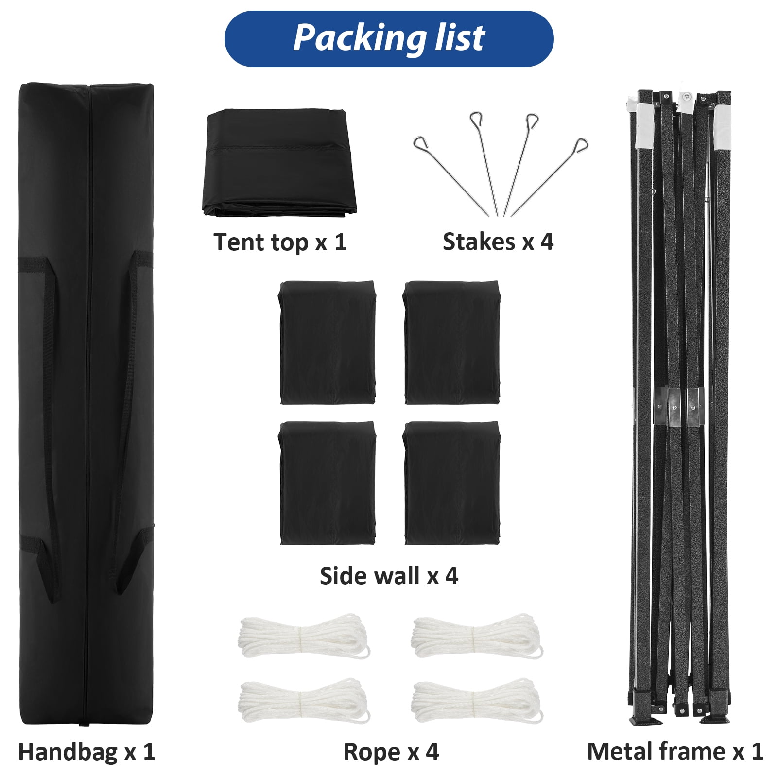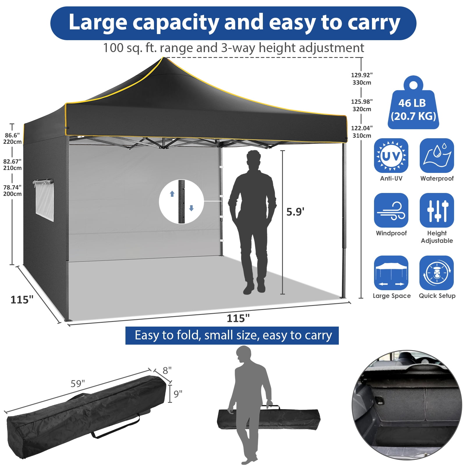 10x10ft sun visor-Pop up portable design-High strength steel frame-Waterproof, sun proof, and UV resistant Oxford cloth-Detachable side walls-Height adjustable-Complete set of accessories Easy One-pull pop-up installation, adjustable height step1: unfold the pre-assembled steel frame step2:fix the top tarp with velcro and snap the top in place with just some effort step3:press the buttons on the legs to adjust the height step4:use velcro to add the side walls as needed Key Features 【Sun Protection Fabric】The tent for parties is made of high-density 420D Oxford polyester fabric, with silver-plated PU lining, waterproof and sunscreen(UPF 50+), which can blocks 99% of the sun’s harmful rays. Suitable for year-round use. 【Sturdy Metal Frame】The tent for backyard is constructed by all steel frame.The metal legs measure 30x30mm and are 0.6mm thick, which is strong, durable and rust-resistant. Use the included ground stakes and ropes to increase the stablility of the canopy. 【Easy to Set Up and Take Down】Pop up canopy 10×10 comes with a folding metal base. Unfold the metal base and secure the fabric cover. There are metal buttons on each corner that you press to lock the canopy in place. Then use the buttons on the legs to easily adjust the height, 3 levels of adjustment to choose(7.2-6.89-6.56 FT) . 2 people can do it in 5 minutes. It’s just as quick to take down. 【Removable Sidewalls】The easy up canopy 10×10 has 4 detachable side walls. With Hook-and-loop fastener, you can add or detach 2, 3 or even all side walls in different occasions, to get great flexibility and more user options. Widely used for outdoor camping, backyard gathering, marketing event, beach shade, birthday parties and more. 【Packing List】Framework and tarpaulin, four fastening cords in white, four pegs or fastening anchors for the floor, a storage bag, an instruction manual.We provide free return service and warranty service. If there are any questions about our products, please feel free to contact us through the help page.