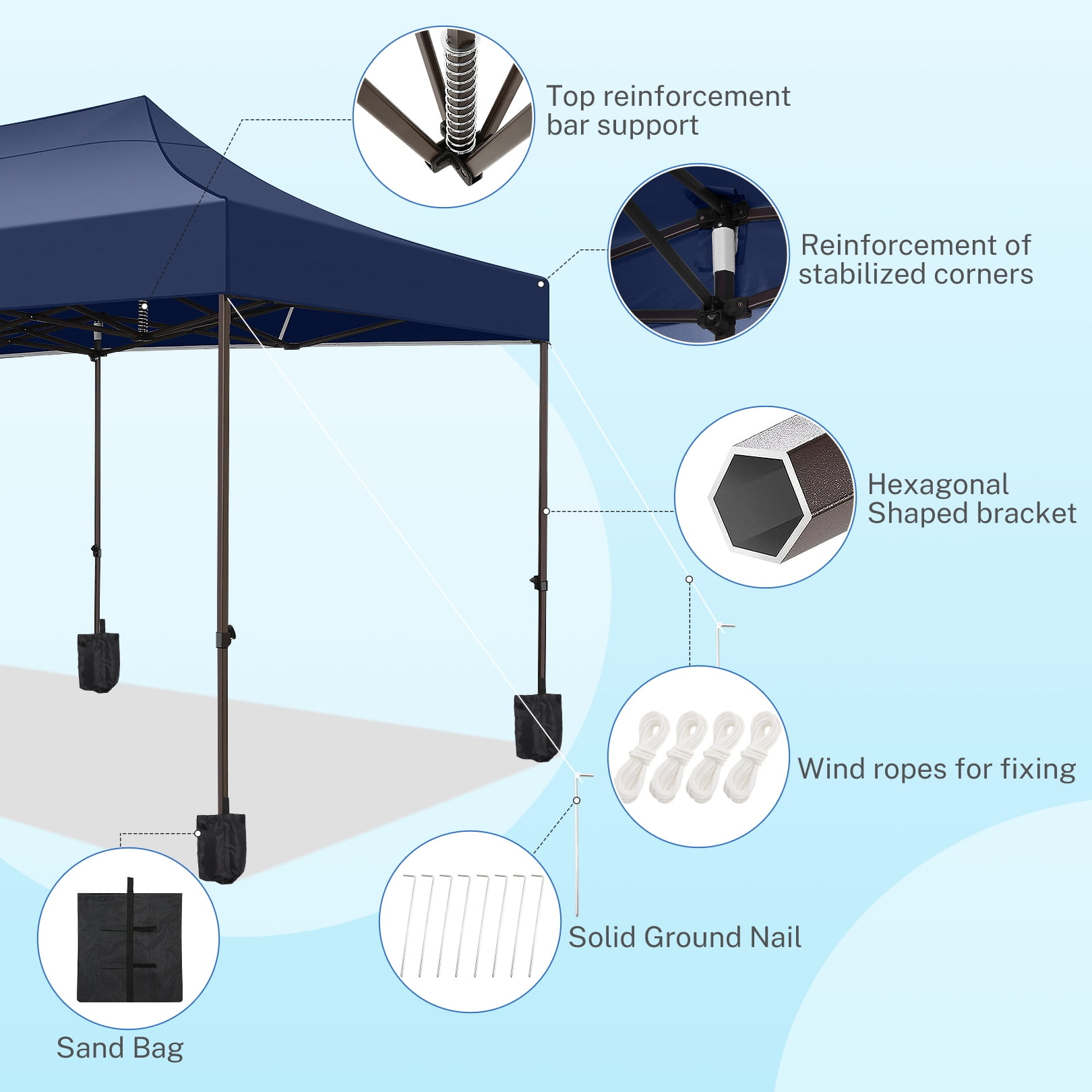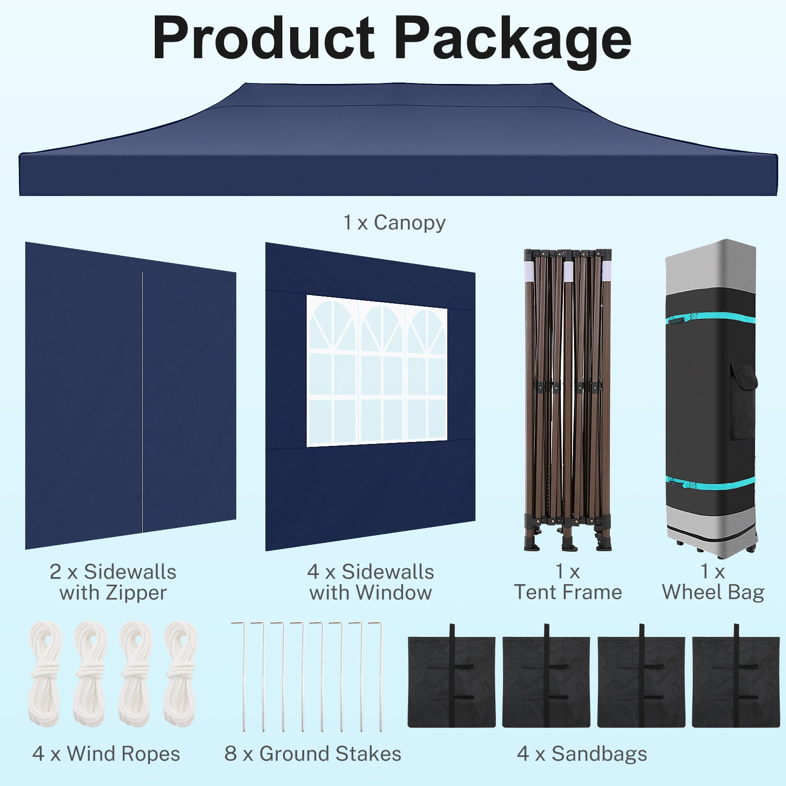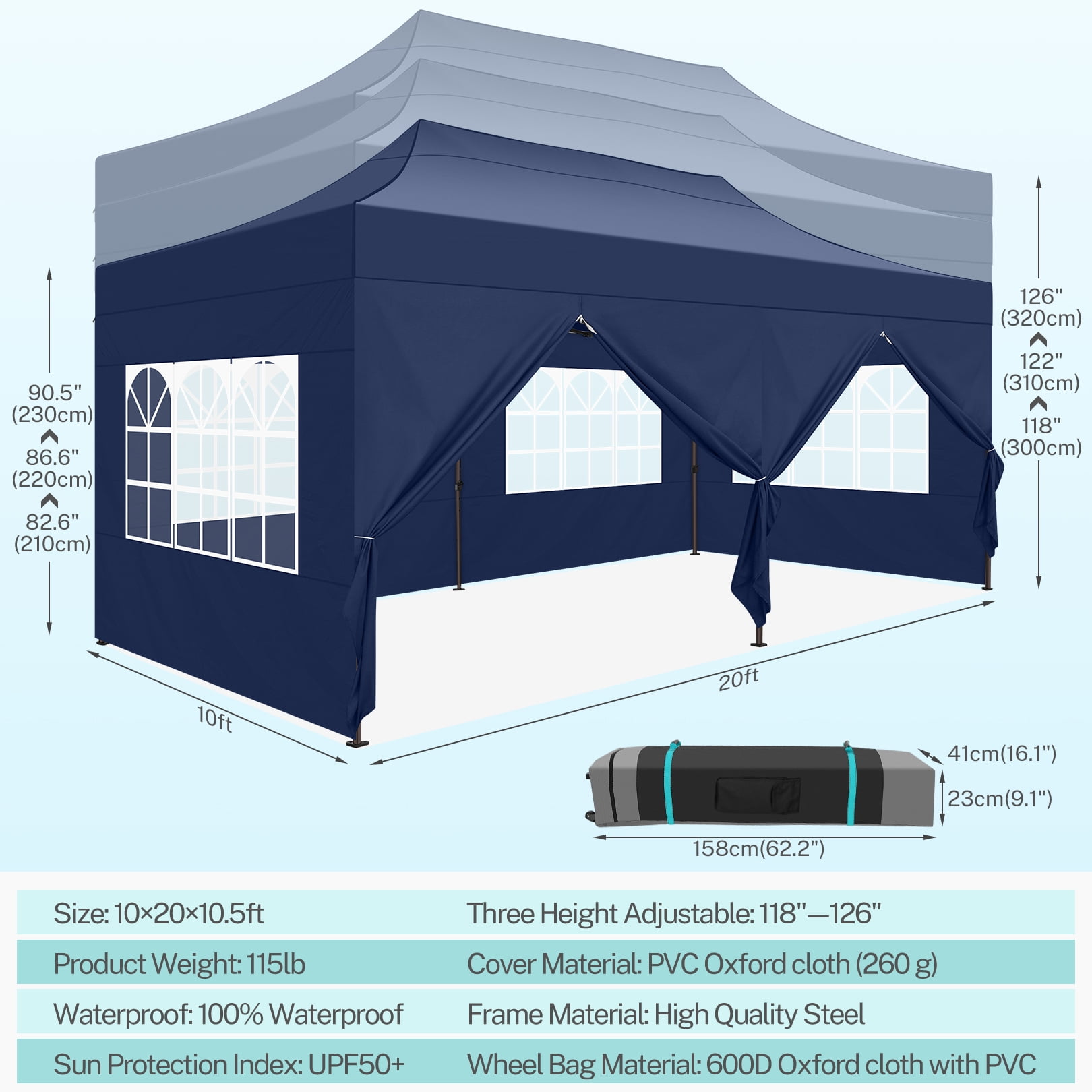 Specifications: Material: 420D Oxford PVC of Top Cover; Oxford Cloth of Wheeled Carrying Bag. Steel Pipe: 1.6” hexagonal legs tube Canopy Size: 10 x 20 ft. Top Height: 118”/122″/126″, Three Height Settings Side Height: 82.6″ 86.6″ 90.5″,Three Height Settings Product Size: 240″L x 120″W x 122″H. Product Weight: 115 lbs Package size: 65.75”x16.7”x12.6” Package Content: 1 x Canopy Tent Top Cover 6 x Side Wall 1 x Foldable Steel frame 1 x Top plastic parts 1 x Foot tube plastic parts 8 x Ground Nail Stakes 4 x Ropes 1 x Wheeled Carrying Bag 1 x User Manual(If you have any questions or problems, please contact us by email, and we will reply as soon as possible and find a solution.) Note: Store the canopy tent in a dry place. Do not use this party tent in heavy stormy weather, to extend its service life