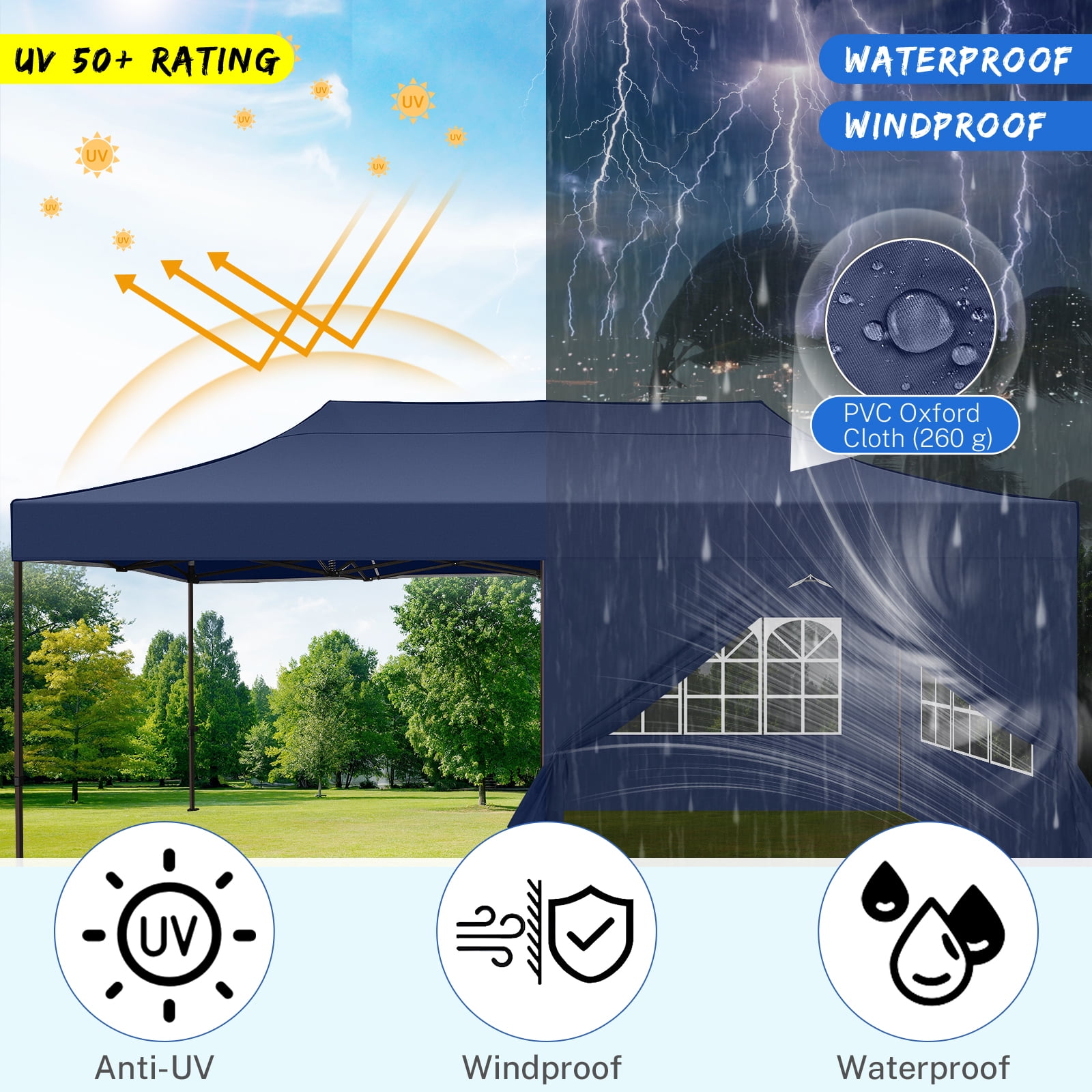 【Upgrade Heavy Duty Canopy】 The COBIZI 10×20 Heavy Duty Canopy features a commercial-grade full truss structure constructed from durable powder-coated stainless steel. The thickness of the 1.77 inch (45mm) hexagonal legs has been increased to 0.7mm/0.03 inches, providing superior stability and durability. 【Premium Quality Fabric】 10 x 20 pop up canopy tent is made of 260g waterproof oxford fabric. The top fabric is coated with two layers of PVC with heat-sealed seams waterproof strip technology, 100% waterproof and blocks 99% UV rays. 【Easy to Set Up, Large Space】10 x 20 Party Tent with sidewall provides a 200 sq. ft. of shade area, large enough to accommodate 15-20 people. 2-3 people can set it up in minutes without carrying any tools. Height is adjustable to 118 inches, 122 inches or 126 inches. The waterproof canopy can be used in commercial areas, playgrounds, courtyards, beaches, farms, gyms,parties, weddings, barbecues, trade shows, sports events, disaster relief, or any outdoor activities. 【Portable Wheeled Bag, Versatile Applications】We provide a solid and tear-resistant 600D Oxford fabric wheeled bag capable of carrying the 10×20 heavy duty Canopy, weighing up to 100 pounds. It features three large standing wheels and reinforced handles for easy mobility and transportation. 【Included Accessories, Warranty Service】 1x Commercial Grade 10×20 Pop Up Tent Frame, 1x Top Cover, 6x PU Coated Panels (4 x Sidewalls with Windows and 2x Sidewalls with Zippers), 4x 420D Oxford Fabric PVC Coated Sandbags, 8 x Ground Pegs, 4x Windproof Ropes, 1x Rolling Bags, 1x Manual. We provide 1 year warranty service.