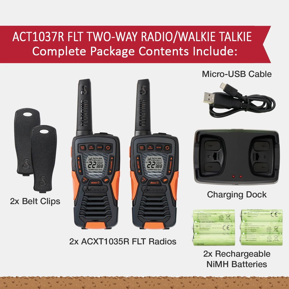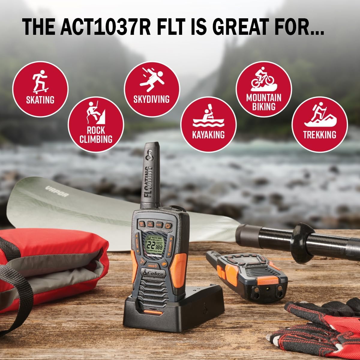 Cobra ACXT1037R FLT IP67 Waterproof Floating 2-Way Radio (2-Pack) The Cobra ACXT1037R FLT is the ultimate walkie-talkie for tough environments, offering superior communication and durability. With an impressive 37-mile range and a waterproof (IP67) rating, this radio is designed to float and withstand harsh conditions, making it ideal for outdoor adventures. Stay connected with 22 channels and 121 privacy codes, ensuring secure and private conversations. It also provides instant access to NOAA weather alerts, so you’re always prepared for changing conditions. The innovative Rewind-Say-Again® feature allows you to replay the last 20 seconds of incoming audio, while the Burp feature expels water from the speaker if submerged. Built for reliability, the ACXT1037R FLT is the perfect tool for clear communication, no matter where you are.
