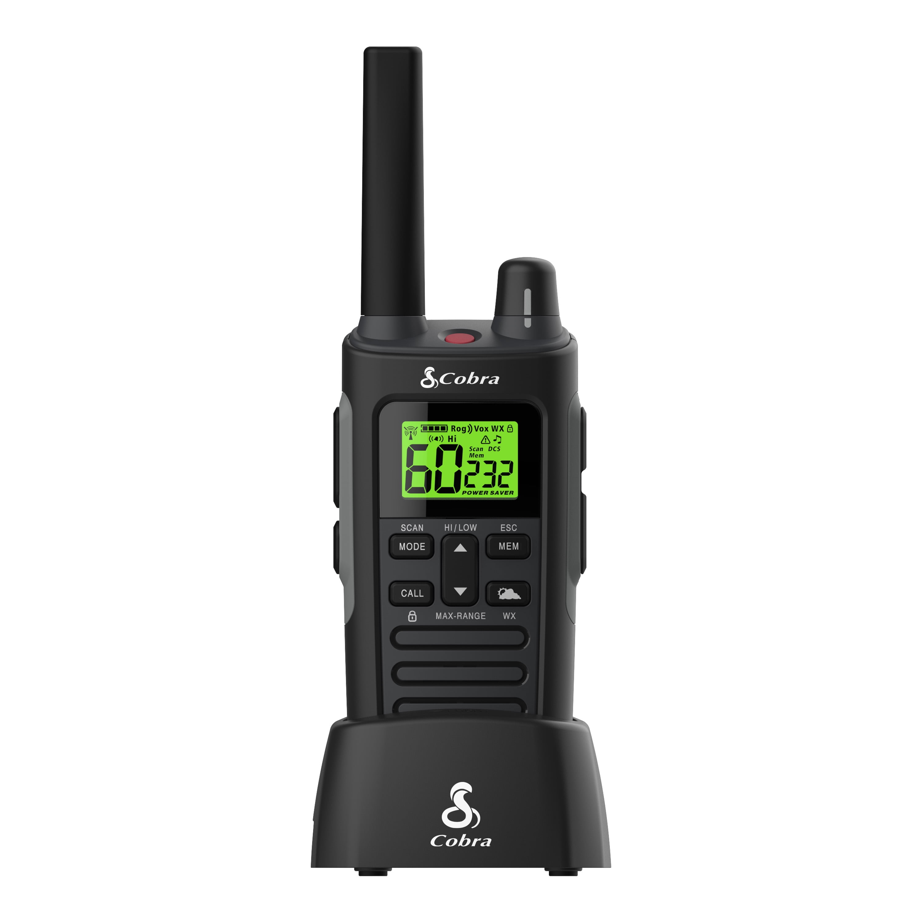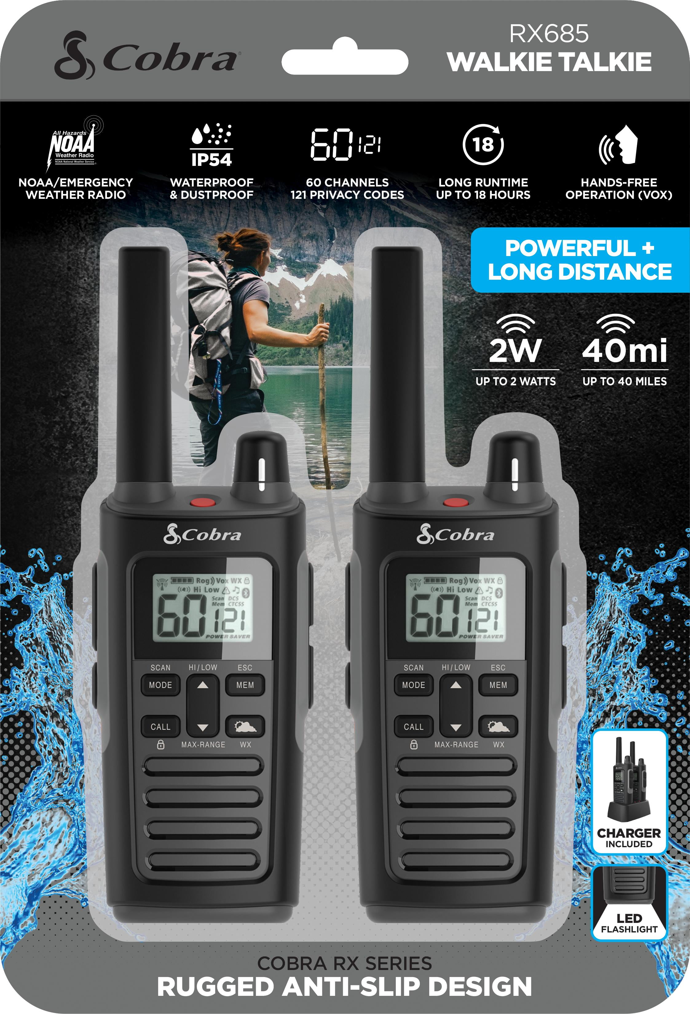 The Cobra RX685 Walke Talkie Rugged, Waterproof & Dustproof 2W FRS Walkie Talkie, 2-Way Radio Meet the new rugged and water resistant RX680 2W FRS Walkie Talkie from Cobra® Electronics. It is designed for tough outdoor adventure with its anti-slip grip, built-in LED flashlight, dedicated volume/power knob and a large LCD screen. It boasts an impressive 40-mile range and 2000mAH rechargeable Li-Polymer battery for long runtime. Ideal 2-way radios for trail blazers exploring the wild! Cobra Electronics is a 50-year old global brand which focuses on mobile communication and navigation products. #1 in US Consumer Market with majority market share.