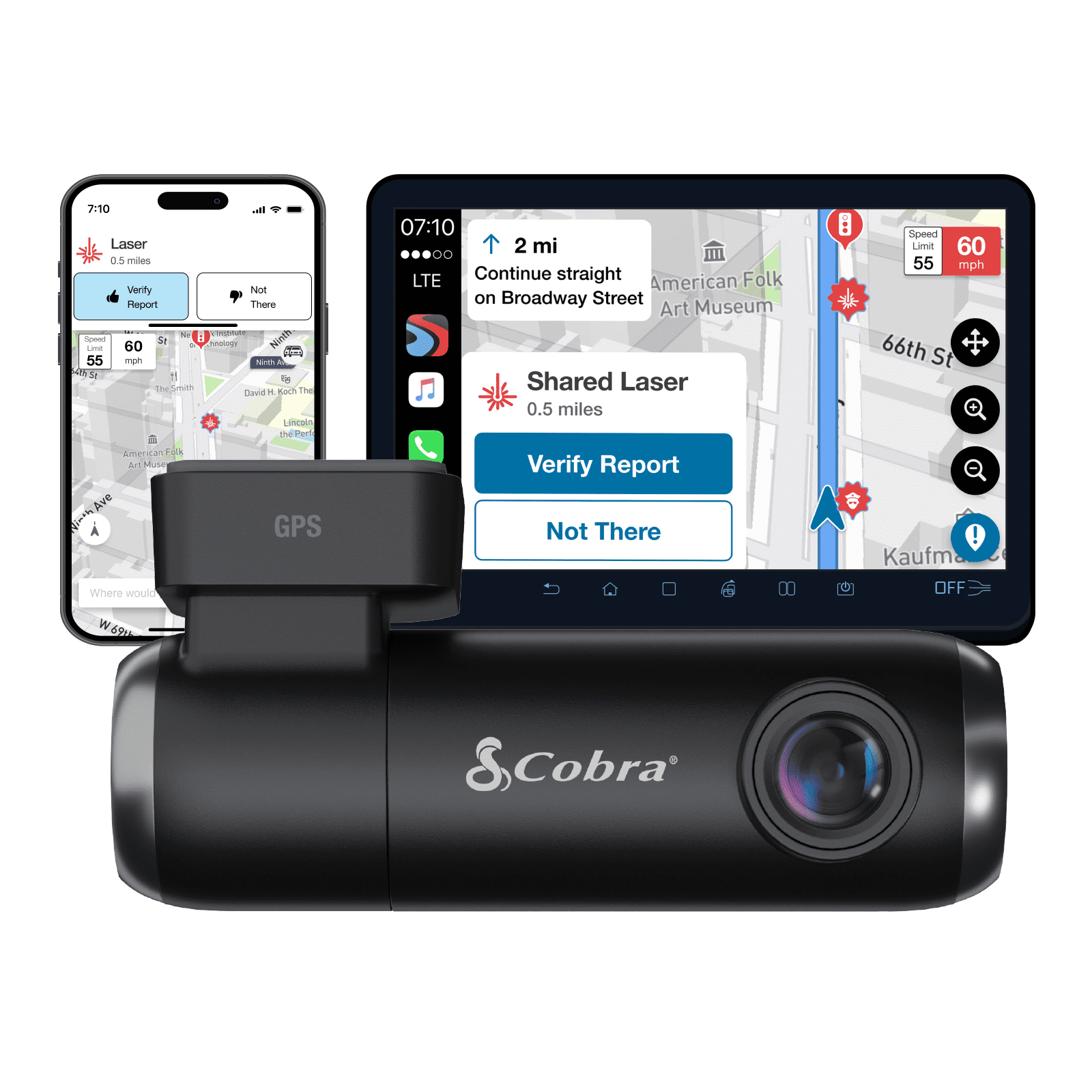 Cobra SC 100 Single-View Smart Dash Cam – 1080P Resolution, Wi-Fi & GPS with our Newly Improved Drive Smarter App with Apple CarPlay® & Android Auto® Integration There’s Never Been More Safety in Simplicity Life is full of uncertainty. Life on the road, even more so. Take some of that uncertainty away with the Cobra SC 100. This dash cam was designed with safety in mind, offering you front and rear recording, live police alerts, Incident Reports, and Mayday Alerts if a severe impact is detected. The SC 100 is there to help protect you and the ones you love from life’s blindspots. Featuring Full HD 1080P video resolution that continuously records the road ahead, you’ll be able to capture anything that may happen. An included SD card and cloud storage allow you to record videos locally and save emergency videos and photos in the cloud. Record ahead, behind, and even inside the vehicle all at the same time so you can cover all the angles and know exactly what happened. Connect to the Drive Smarter® community to get live, shared alerts from other detectors and drivers across the country. Plus, with Apple CarPlay® & Android Auto® compatibility, you can easily view your route and interact with alerts on your vehicle’s display. Your Travel Guide & Your Camera Crew Cobra SC Series dash cams are designed to protect you against life’s blindspots: past, present, and future. That’s why they’re the only dash cams that feature both trip-planning and heads-up navigation, so you’ll never have to look down at your phone while you’re behind the wheel. While an ordinary dash cam can tell you where you’ve been, only the SC series dash cams can show you where you’re headed. The Best Defense is a Sensor-Based Offense We’ve engineered our dash cams to protect you from anything that happens on the road. That’s why they’re the only dash cams that can display upcoming speed traps from a sensor-based network that’s more accurate than the leading crowd-sourced app. Because the best way to protect you from life’s blindspots is to make sure you know what lies on the road ahead.