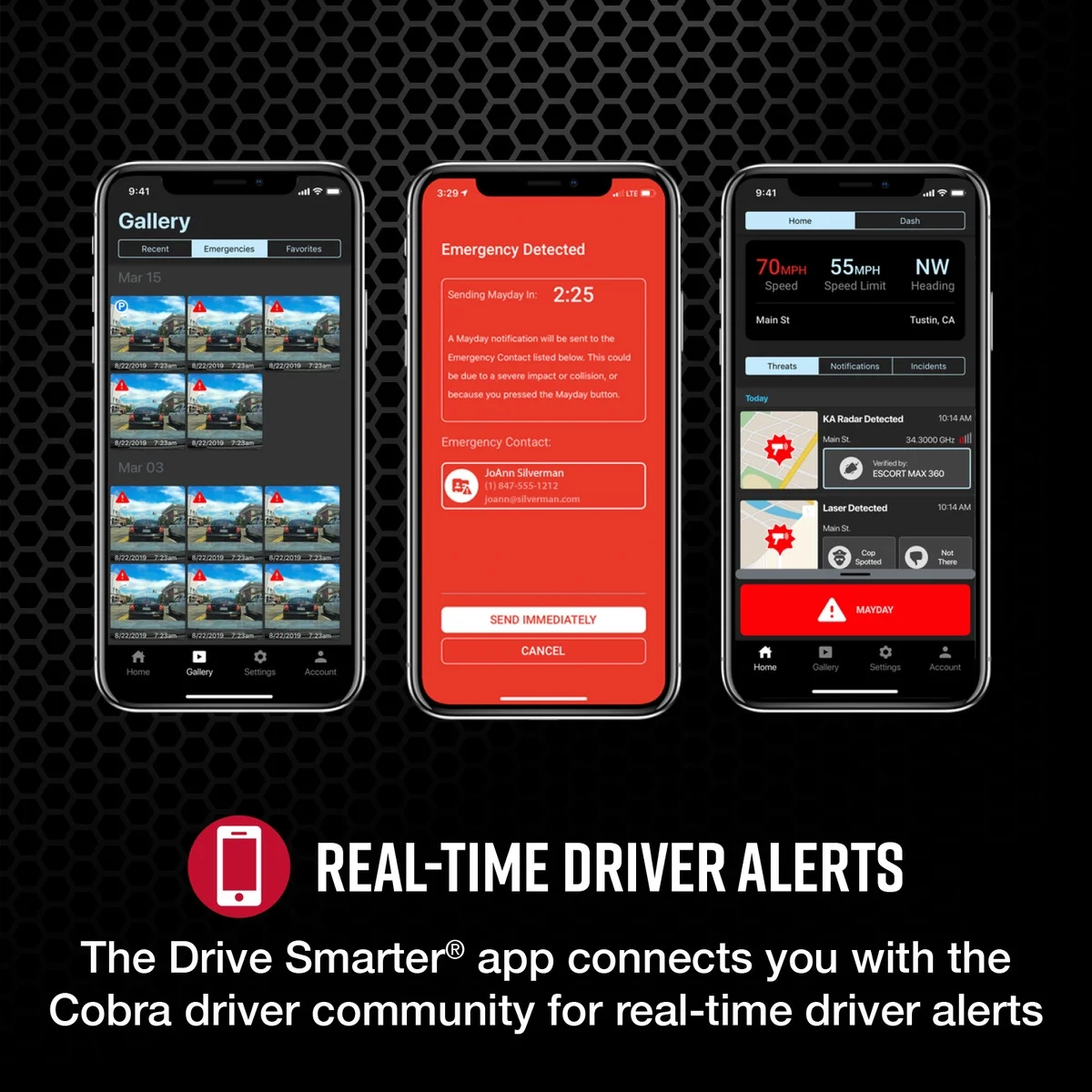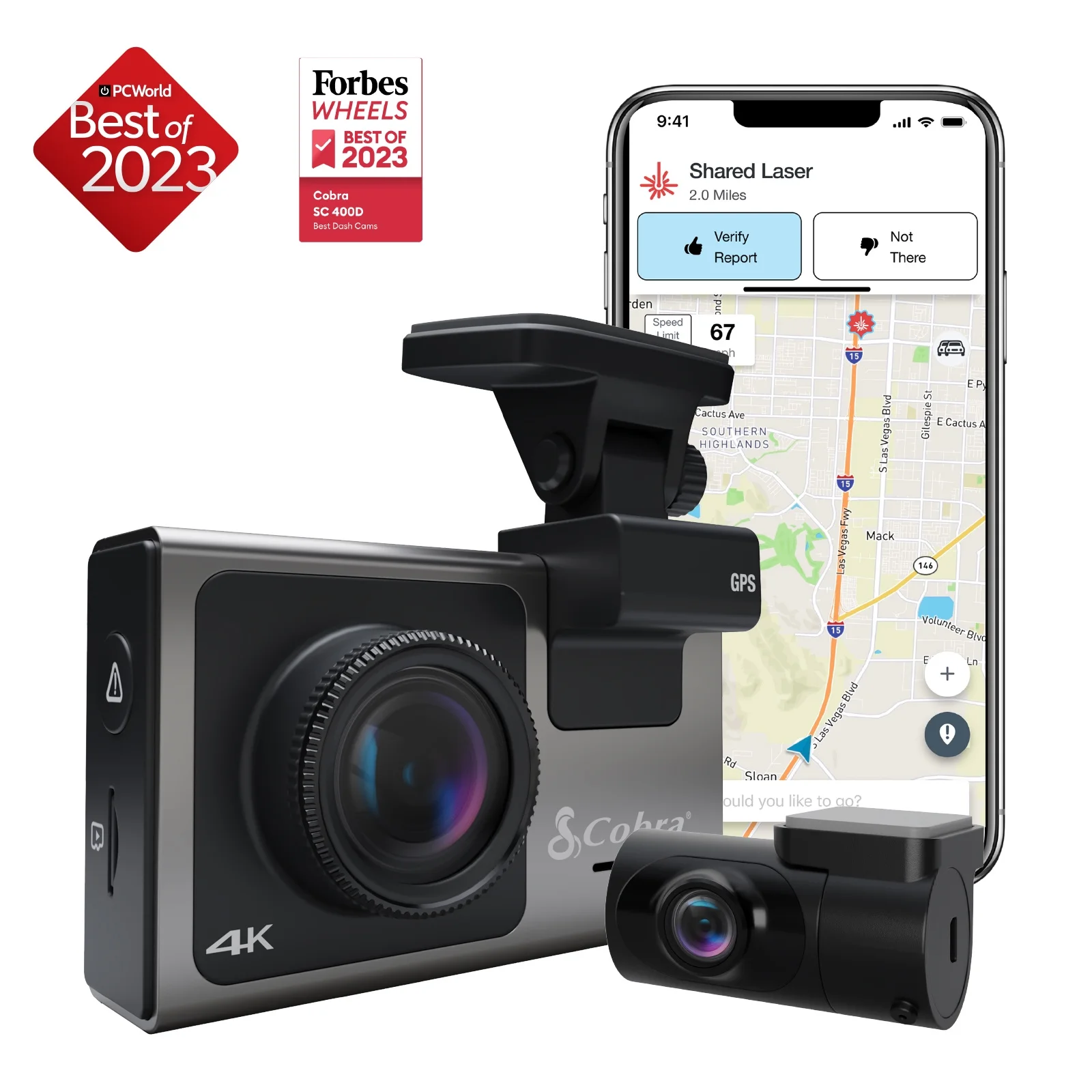 Cobra SC 400D Smart Dash Cam + Rear Camera with UHD 4K Resolution, Wi-Fi, Bluetooth, GPS + Apple CarPlay® & Android Auto® Integration The Ultimate Solution to All of Life’s Blind Spots Whether you’re on the road or parked, a commercial driver or commuter, hauling cargo or chauffeuring kids – you’re covered. With easily sharable 4K UHD resolution, virtual assistance built-in, navigation, live police alerts, 3-camera capability, and more – there’s no better way to protect the vehicles, drivers, and passengers you value most. See just how much peace of mind the award-winning Cobra SC 400D can provide. Your Travel Guide & Your Camera Crew Cobra SC Series dash cams are designed to protect you against life’s blindspots: past, present, and future. That’s why they’re the only dash cams that feature both trip-planning and heads-up navigation, meaning you’ll never have to look down at your phone while you’re behind the wheel. While an ordinary dash cam can tell you where you’ve been, only the SC series dash cams can show you where you’re headed. The Best Defense is a Sensor-Based Offense We engineered our dash cams to protect you from anything that happens on the road. That’s why they’re the only dash cams that can display upcoming speed traps from a sensor-based network that’s more accurate than the leading crowd-sourced app. Connect to the new & improved Drive Smarter® App community to get live, shared alerts from other detectors and drivers across the country. Plus, with Apple CarPlay® & Android Auto® compatibility, you can easily view your route and interact with alerts on your vehicle’s display.