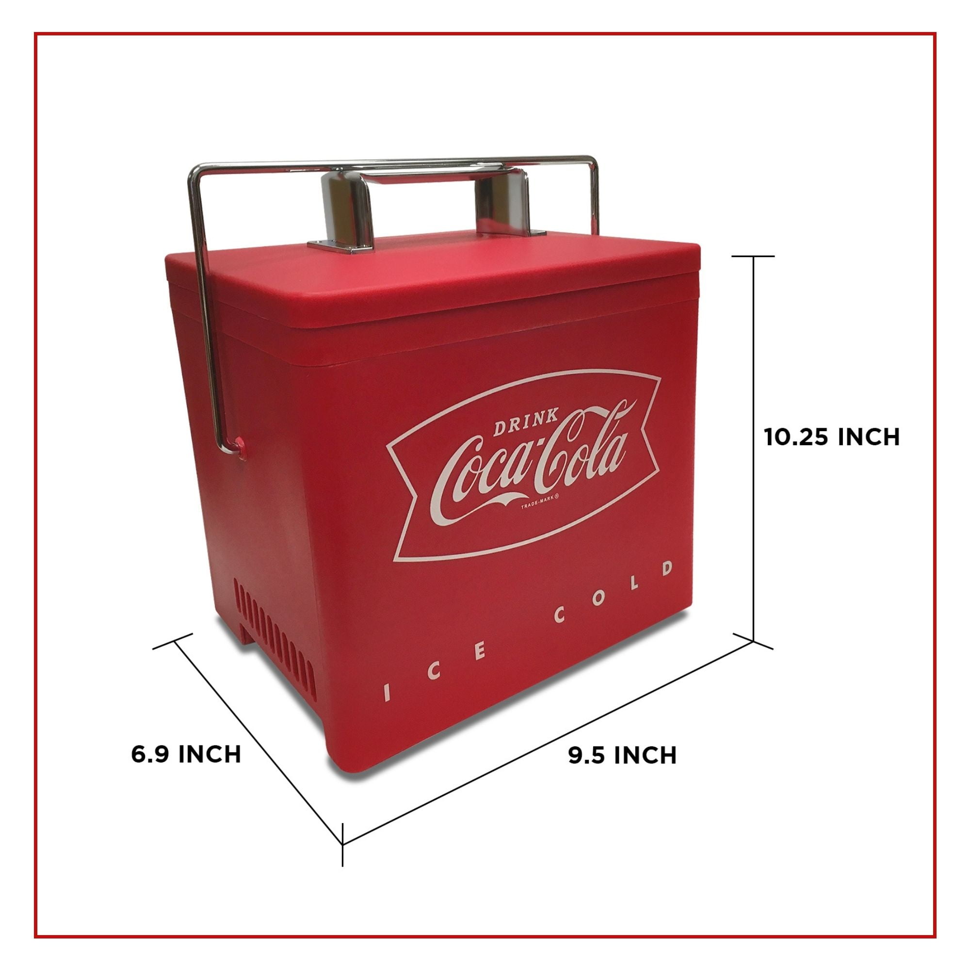 Retro Ice Chest Style: Official vintage Coca-Cola artwork, retro ice chest design, vibrant red exterior, and polished chrome accents make this mini cooler a unique and eye-catching accessory for your office, patio, boat, or RV Compact Size with 4 L (4.2 qt) Capacity: Convenient personal cooler holds 6 standard soft drink cans and fits easily on a desk or shelf. Dimensions: 6.9 in (17.5 cm) x 9.5 in (24.1 cm) x 10.25 in (26 cm) Advanced Thermoelectric Cooling: Eco-friendly iceless technology efficiently cools to 32°F (18°C) below surrounding temperature with no harmful chemicals or wasted energy AC and 12V DC Capable: Compact portable mini fridge/warmer runs on DC and AC power and comes with both cords so you can use it at home or on the go; ideal for home, dorm, office, truck, trailer or RV Unique Gift Idea: Portable design, eye-catching silver chrome accents, and classic Coca-Cola graphics make this travel cooler an ideal fun and functional gift for dads, students, teens, and more.