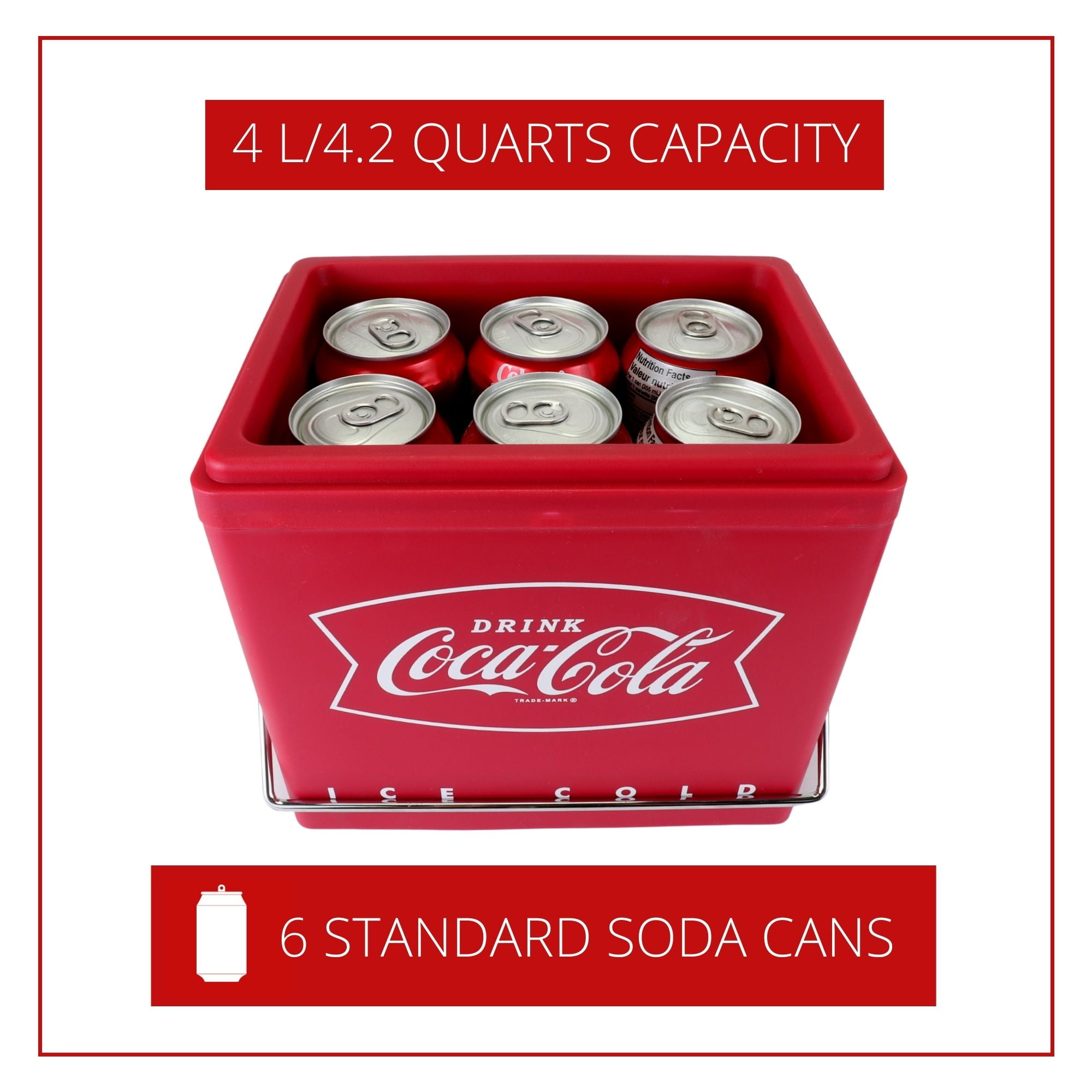 This lightweight 4 L/4.2 qt mini cooler combines retro ice chest style with modern thermoelectric cooling technology for a fun and functional accessory that holds 6 standard soda cans. It features official Coca-Cola artwork, an eye-catching red exterior, and polished chrome accents, including a secure locking lid, and efficiently cools to 32°F (18°C) below the surrounding temperature with no harmful chemicals or wasted energy..