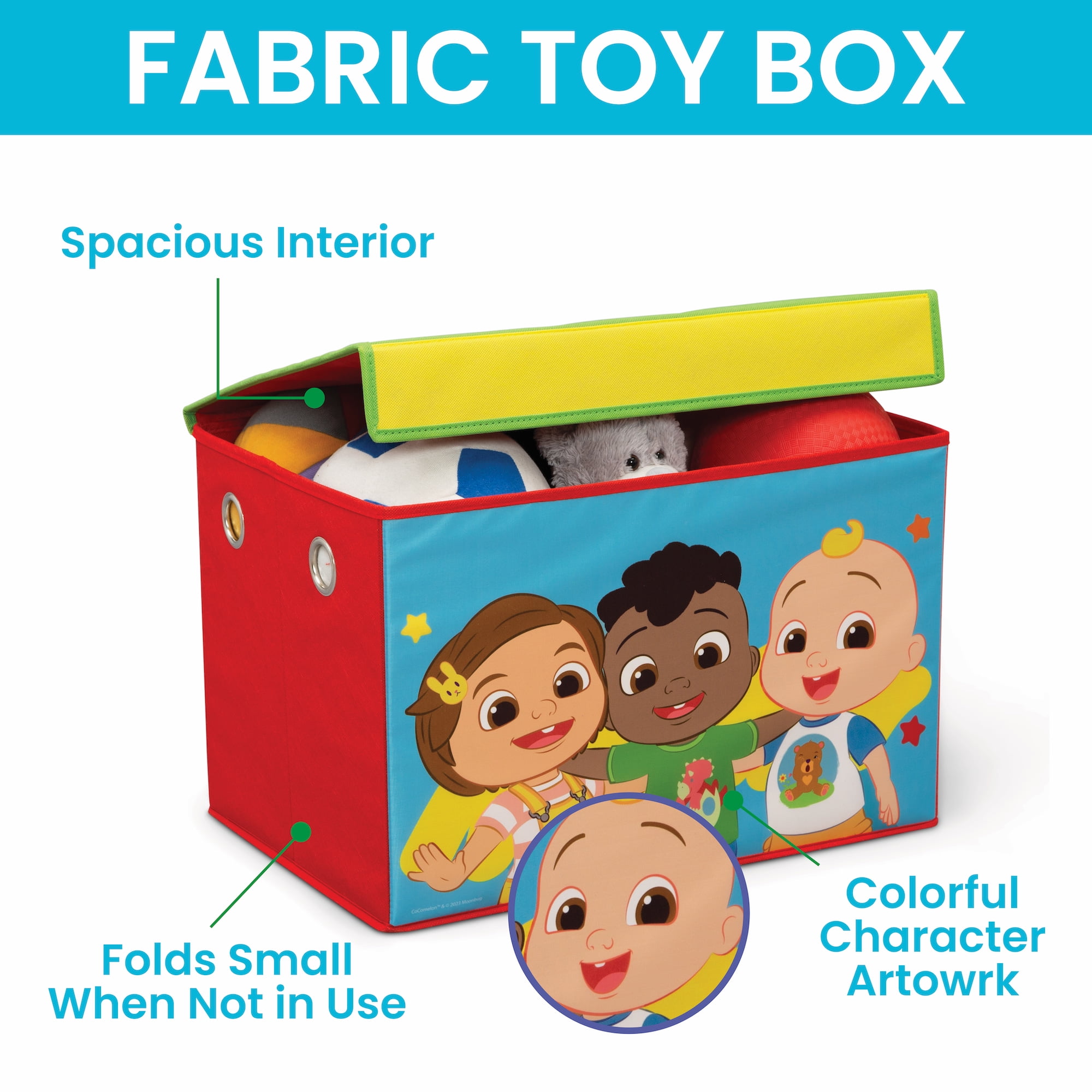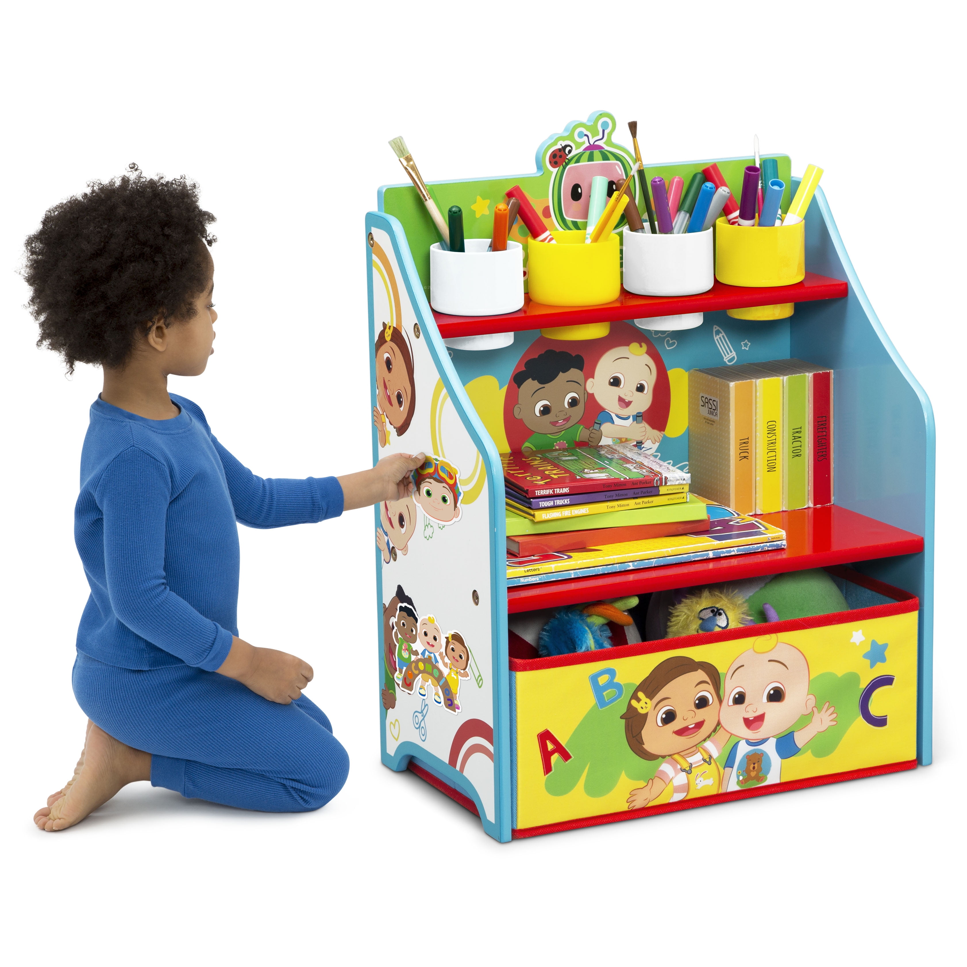 WHAT’S INCLUDED: This Art & Play Toddler Room-in-a-Box Set includes 1 Draw & Play Desk, 1 Art & Storage Station and 1 Fabric Toy Box FOR COCOMELON FANS: Colorful CoComelon graphics makes this a must-have set for any fan LET’S GET CREATIVE: Cater to your little one’s creative side with this artistic set that makes it easy for kids to draw, paint, play and learn, while at the same time develop imagination, creativity and hands-on ability | Great holiday or birthday gift REUSABLE STICKERS: Kids will love arranging the included reusable vinyl cling stickers to the sides of the Art & Storage Station to create a new story every time they play TONS OF STORAGE: This set offers endless storage options to keep art supplies organized when your child is done playing | Desk features marker holders and a side compartment | Art & Storage Station includes a fabric storage bin and four compartments for markers, paint brushes, crayons and more | Fabric Toy Box provides storage for toys big and small, plus folds flat when not in use SAFE OPTION: Meets all CPSC requirements and ASTM safety standards | Recommended for ages 3+ SIZE: Desk: 23.23”D x 27.9”D x 18.85”H; Art & Storage Station: 16”W x 9.5”D x 21.5”H; Fabric Toy Box: 22.25”x 13.5”D x 14.15”H | Easy assembly