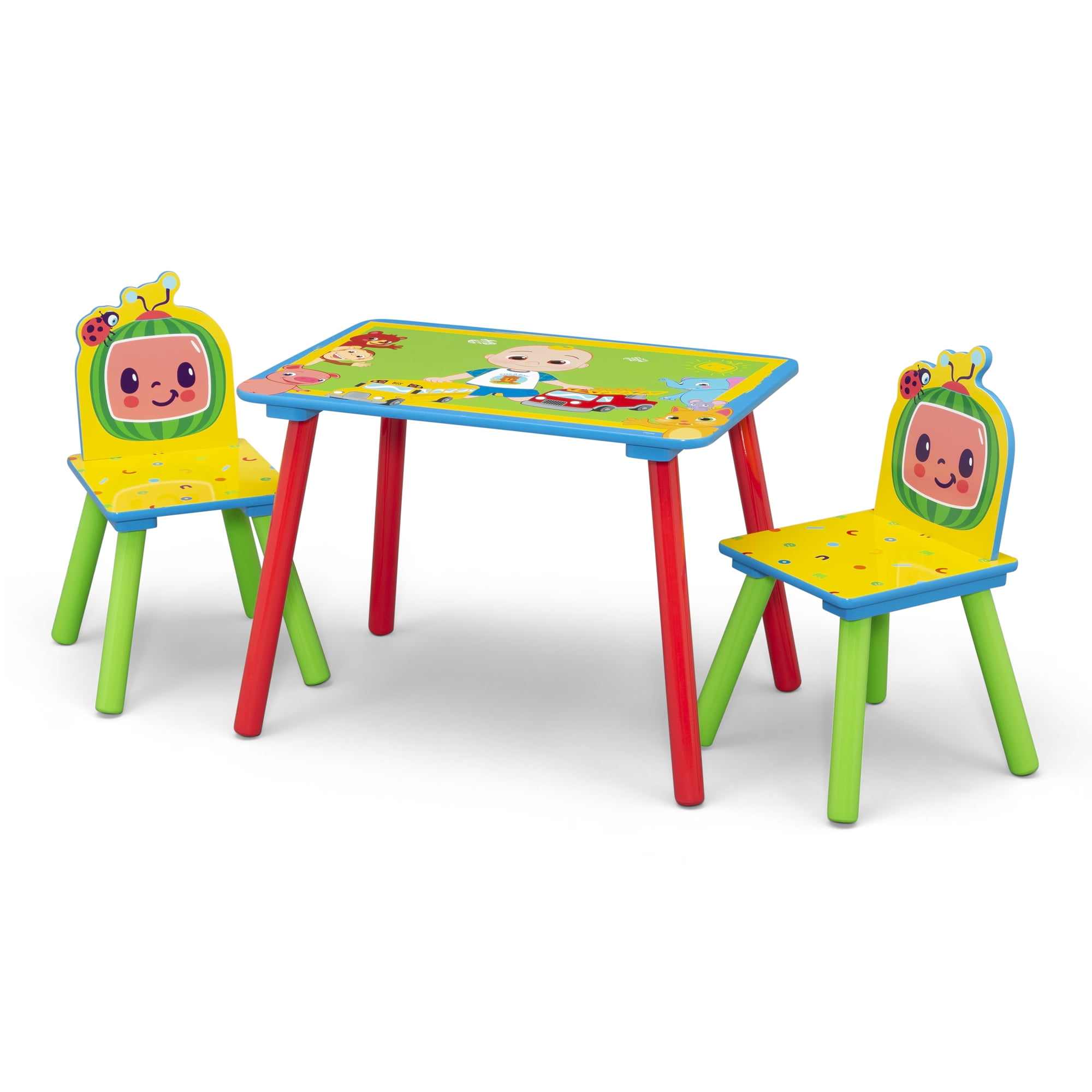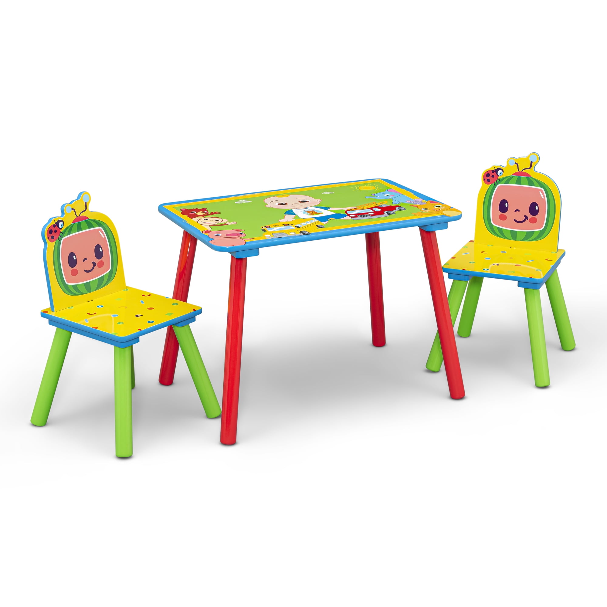 Playtime just got so much cooler with the CoComelon 4-Piece Toddler Playroom Set by Delta Children! A versatile set that provides both seating and storage, it includes a wooden play table with 2 chairs and a 6-bin toy organizer. The wooden play table and 2 chairs are the perfect kid-size height and feature bold CoComelon graphics. The 6-Bin Toy Organizer features a sturdy wooden frame that holds six fabric bins sized for every type of toy, so you can store books, blocks, and more. The toy bin also comes with reusable vinyl cling stickers that allow your child to decorate the sides themselves. Built from sturdy materials, these pieces will standup to years of playtime.