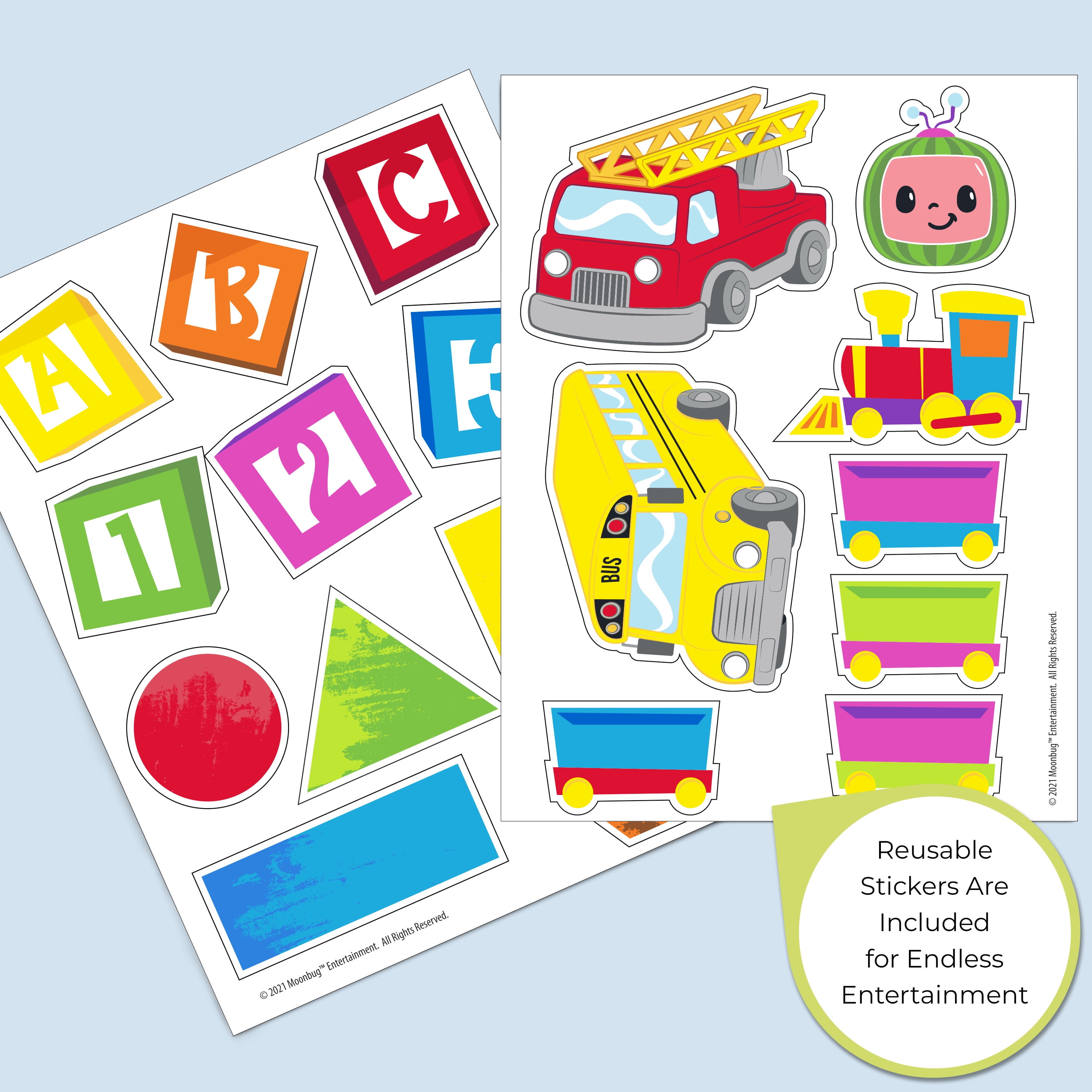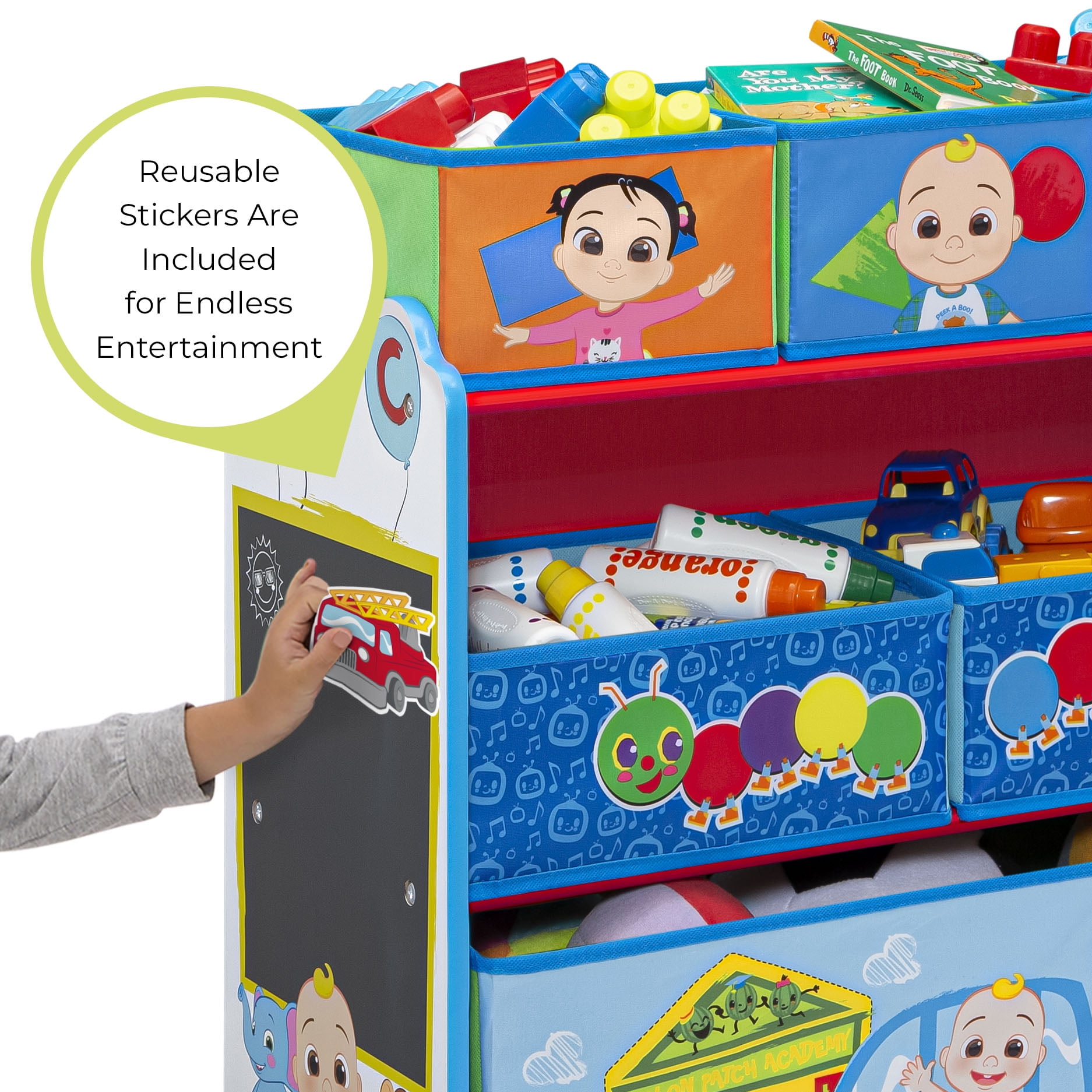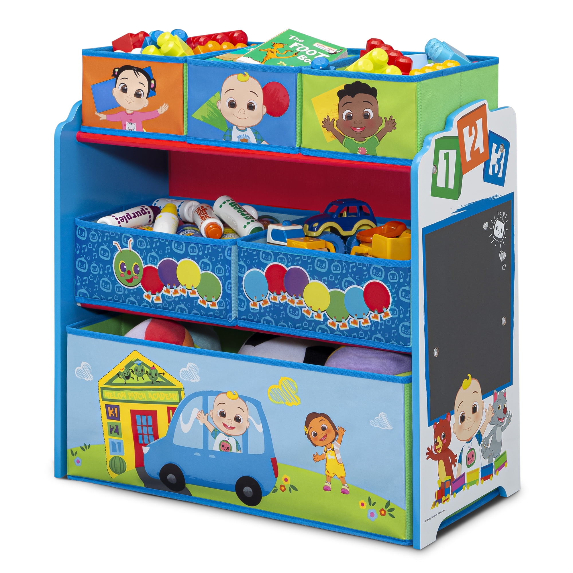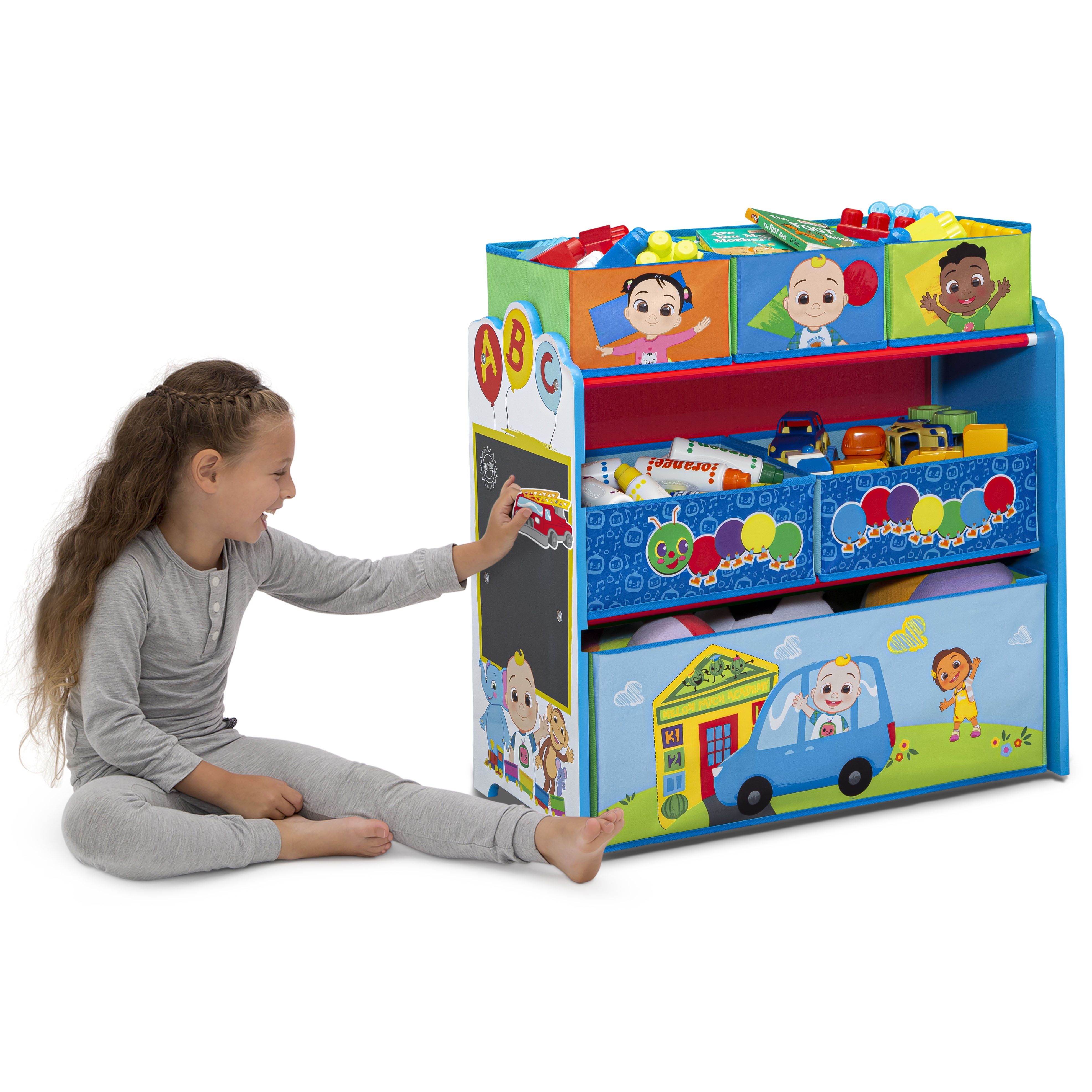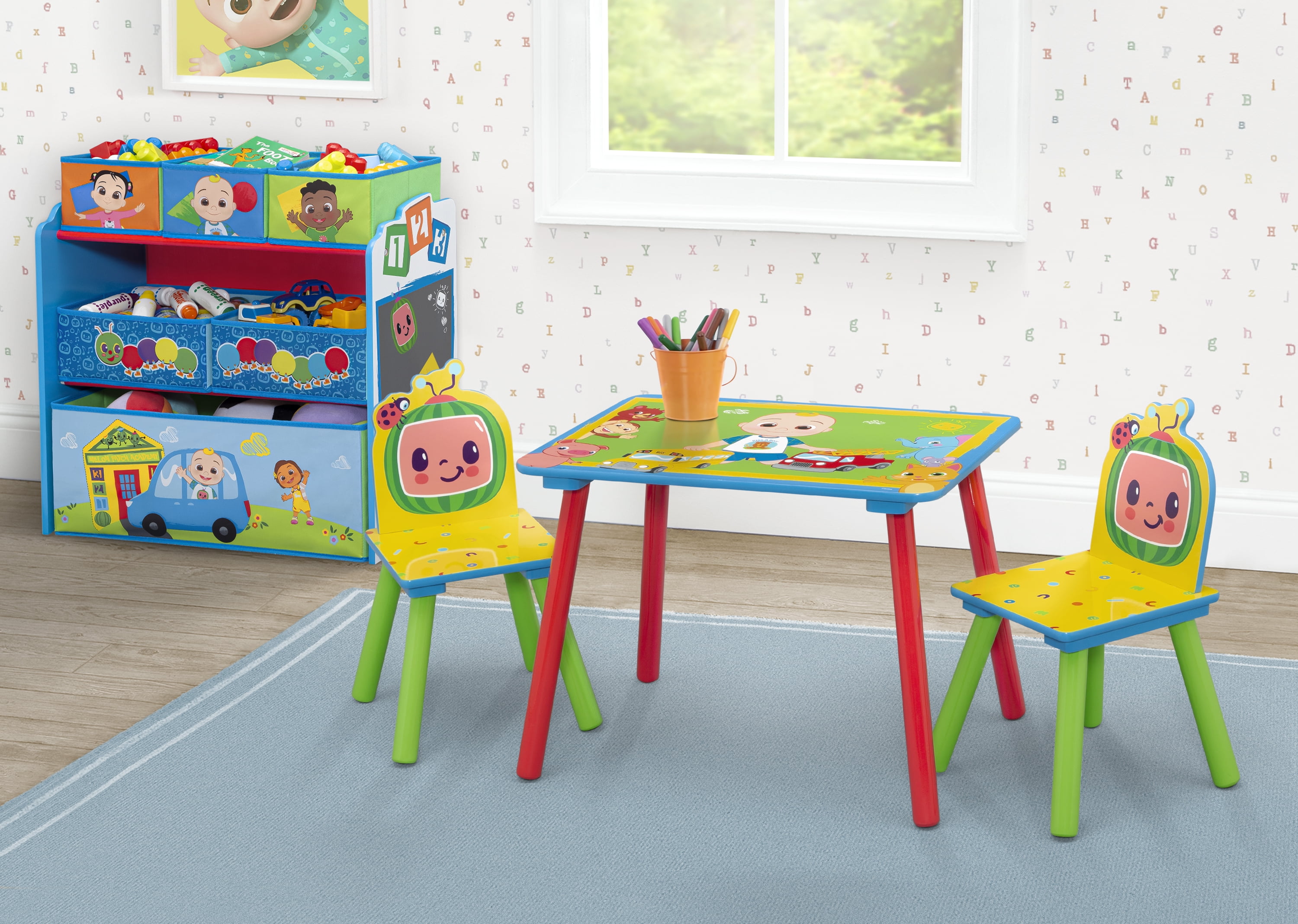 TABLE AND 2 CHAIR SET RECOMMENDED USE: For toddlers and kids ages 2+ | Each chair holds up to 50 lbs. DURABLE CONSTRUCTION: Made of engineered wood and solid wood | Scratch-resistant finish protects the table’s colorful graphics | Easy assembly SAFEST OPTION: Meets or exceeds all safety standards set by the CPSC SIZE: Assembled dimensions: 24”W x 20”D x 17.5”H” DESIGN & STORE 6 BIN TOY STORAGE ORGANIZER AGE RANGE: Recommended for ages 3+ | SAFE DESIGN: Bin meets or exceeds all safety standards set by the CPSC FOR COCOMELON FANS: Toy bin features colorful graphics of CoComelon | Will encourage your child to keep their space neat and tidy REUSABLE STICKERS: Kids will love arranging the reusable vinyl cling stickers to the sides of this organizer to create a new story every time they play TONS OF STORAGE: Toy Bin has 6 bins in varying sizes to fit a wide variety of toys, from small to large DURABLE CONSTRUCTION: Made of engineered wood, solid wood and fabric SIZE: Assembled dimensions: 24.61”L x 11.81”W x 26.57”H | Three medium bins: 7.75”L x 9.5”W x 5”H, two large bins: 11.6”L x 9.5”W x 5”H, one extra-large bin: 23.5”L x 9.5”W x 9.5”H | Easy assembly . . . . . .