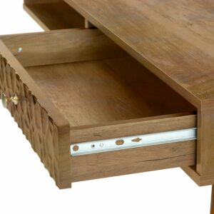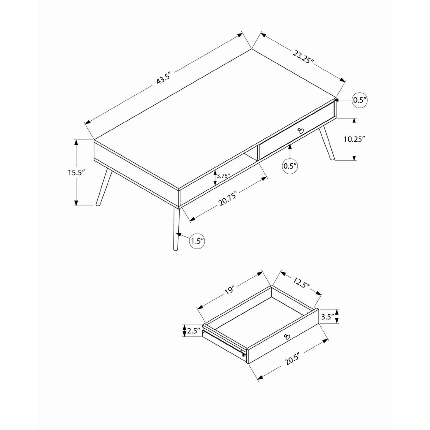 Exquisite styling and exceptional functionality make this coffee table with storage a standout piece for a living room. A distinctive, rippled pattern on the drawer front delivers a captivating visual effect and adds an unexpected element of texture. Gold drawer knobs and detailing on the legs bring a subtle touch of glam. Solid wood legs, which are round and have a tapered shape, mix sturdy construction with chic design. Finished in a walnut wood-look laminate with realistic color variations, this mid-century modern accent table features a rectangular tabletop to display decorative items or serve cocktails and snacks, and 1 shelf and 1 storage drawer that offer convenient storage space.