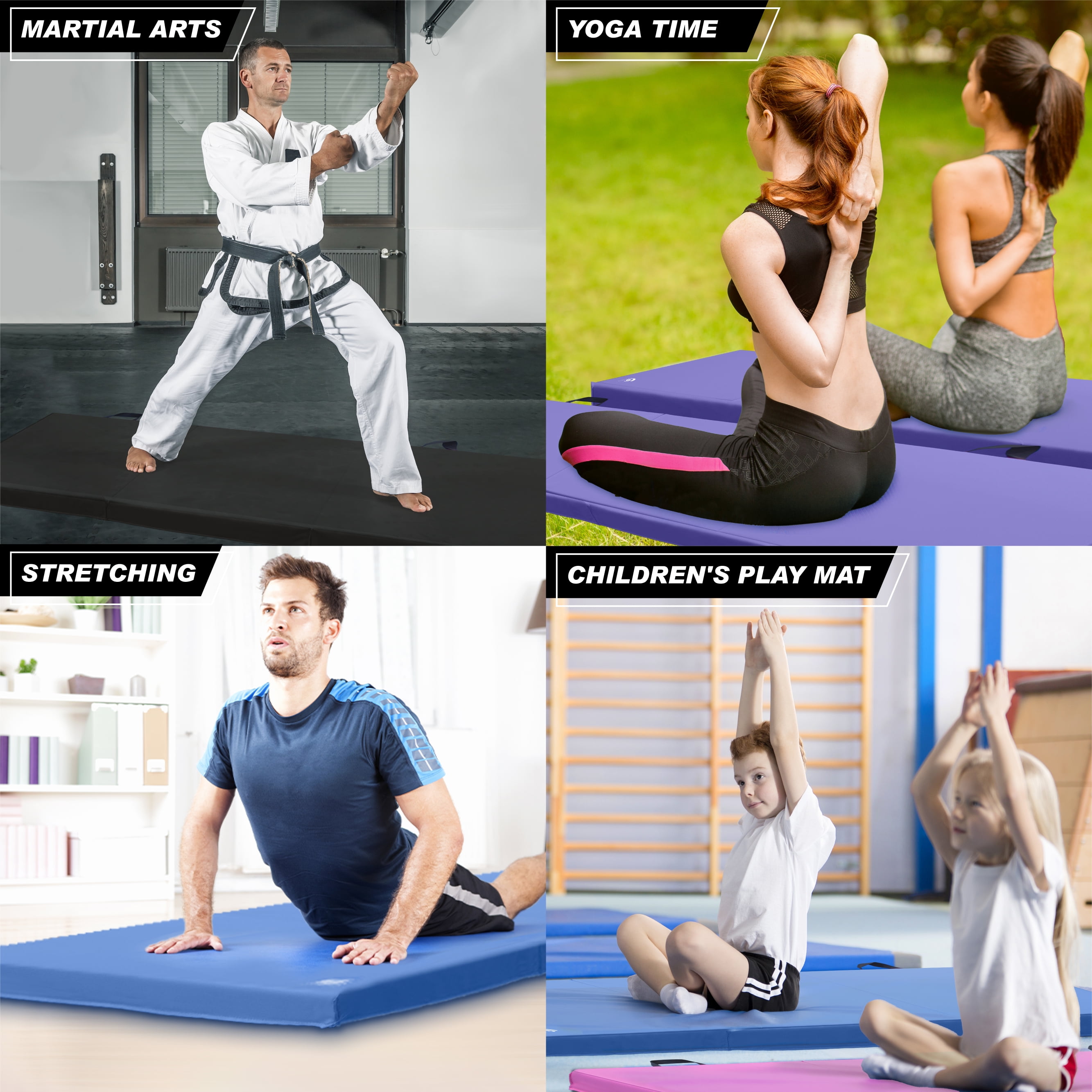 Coinus Sports 4-Panel Folding Gymnastics Exercise Mat is great for stretching, gymnastics, workout routines, yoga, and more 4-fold design and attached handles for easy portability Thick 2″ PVC and polyethylene foam supports your lands and softens your falls Folded profile offers neat, compact storage after use Expanded dimensions: 4′ x 10′ x 2″ Available in black, purple, pink and blue colors