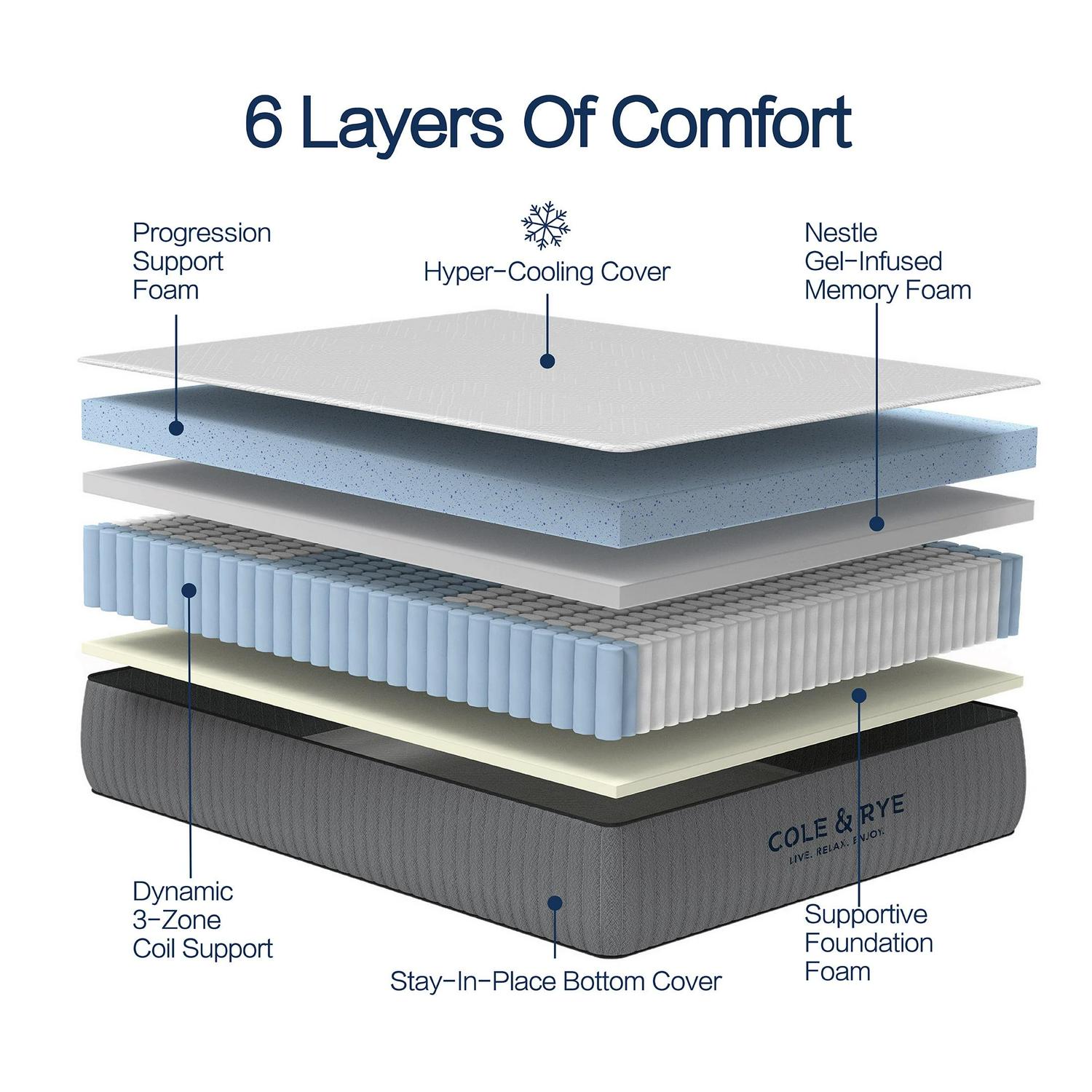 Sink into the comfort of this medium firm ArticSky 12-Inch Gel-Memory Foam Hybrid Mattress. The breathable hyper-cooling cover wicks away moisture and regulates body temperature to keep you cool and dry all night long. The Nestle memory foam layer reduces pressure, while the dynamic 3-zone coil spring system and progression layer provide support. Cooling gel-memory foam pillow(s) are also included*. Each Cole & Rye mattress is made with durable materials and quality construction at an incredible value. The mattress arrives rolled in a box for quick setup and easy movement. Simply unbox, unwrap and unroll.