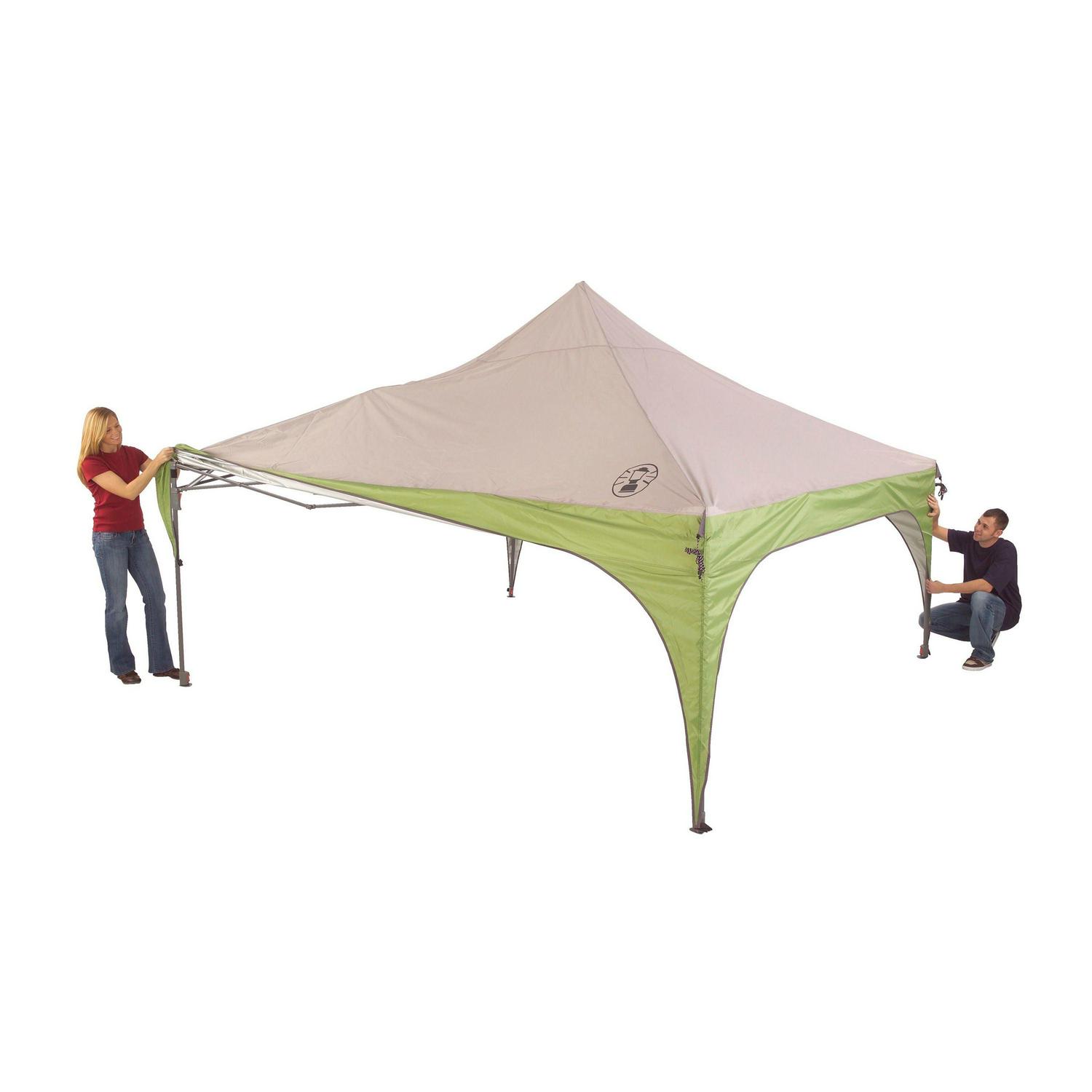 The Coleman 12′ x 12′ Canopy Sun Shelter Tent with Instant Setup assembles in three minutes in just three steps to create a shady area outdoors. This canopy cover is made with UVGuard material that offers protection from the sun s harmful rays and features two-way roof vents to help keep the air circulating when the temperature rises outside. The lightweight pre-attached telescoping poles can be assembled without having to reach over the head, so anyone can set up the tent easily, while comfort grips lock the shelter into place. Once the canopy tent is assembled, it offers stable shelter on grass, concrete, and asphalt thanks to its welded steel feet. The canopy can be stored and transported in the included easy-pull wheeled carry bag.