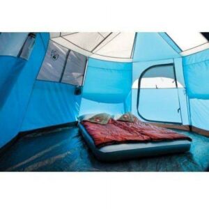 The 13′ x 13′ Coleman Octagon 98 Tent gives you plenty of space to stay comfortable in the outdoors. Setting it up or taking it down is quick and convenient, taking only about 15 minutes. Steel poles create a rugged and durable frame while color-coded pole attachments make setup even easier. The spacious interior of the Coleman Octagon tent fits two queen-sized airbeds or eight people in sleeping bags. There’s even a privacy divider that you can adjust to create the kind of space you need and two doors allow you to enter or exit with ease. Two inner storage pockets provide a place to put gear such as ponchos and more. The exclusive WeatherTec system features patented welded floors and inverted seams as well as a vented rain fly to keep you dry and comfortable when it rains. This Coleman tent also features interior cup holders to keep your beverages upright and off the ground. A mesh roof and windows allow for air circulation and ventilation and keep out bugs.