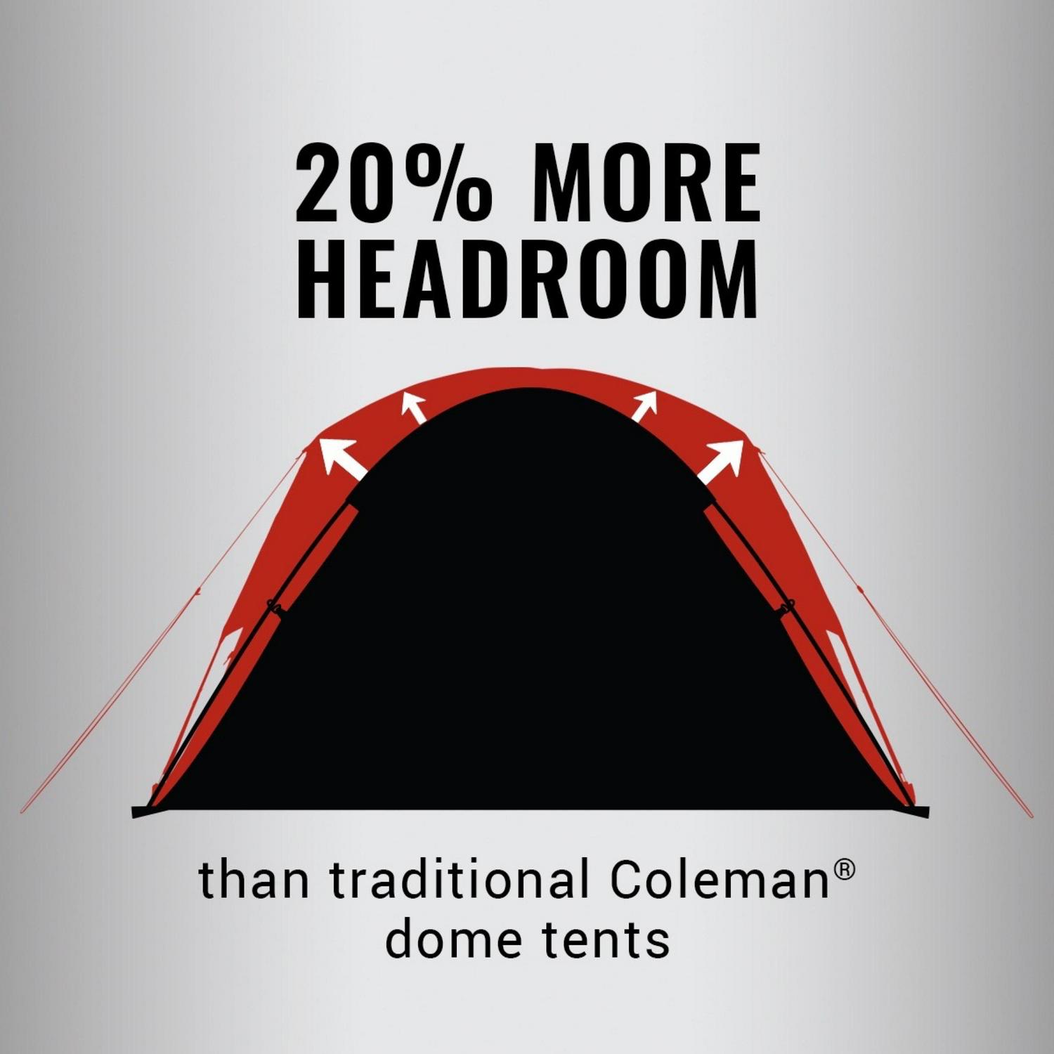 - Nearly vertical walls offer 20% more headroom than traditional Coleman dome tents