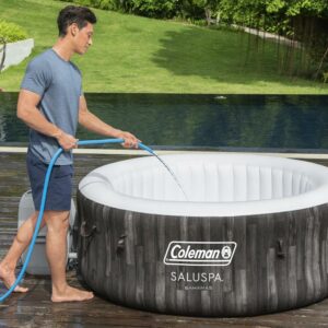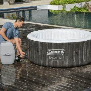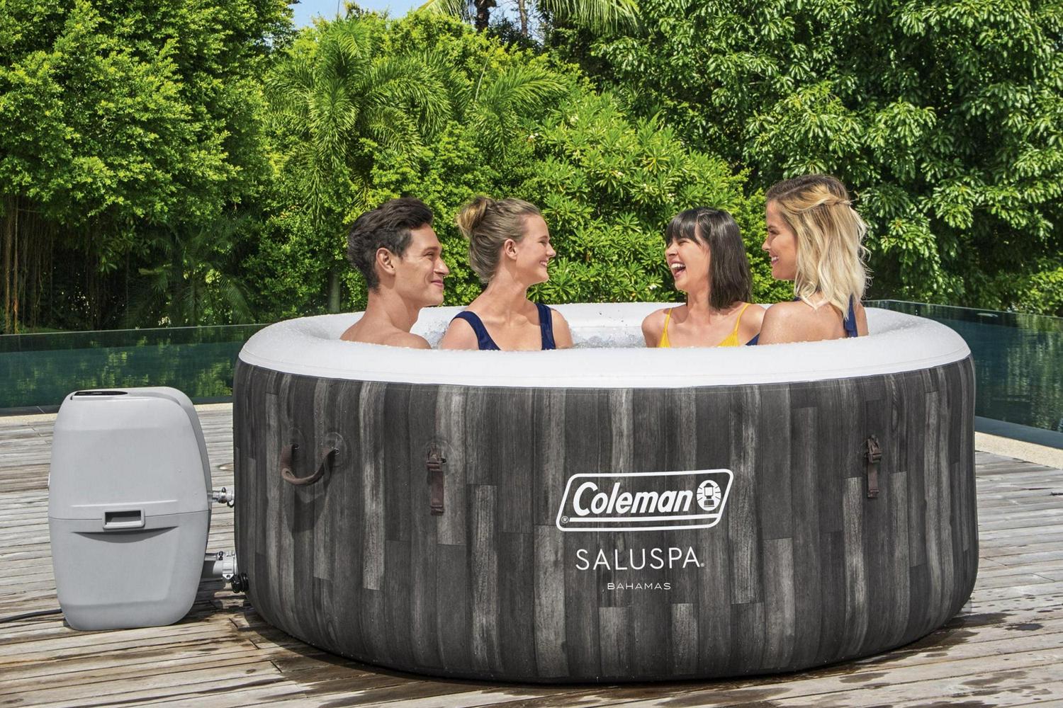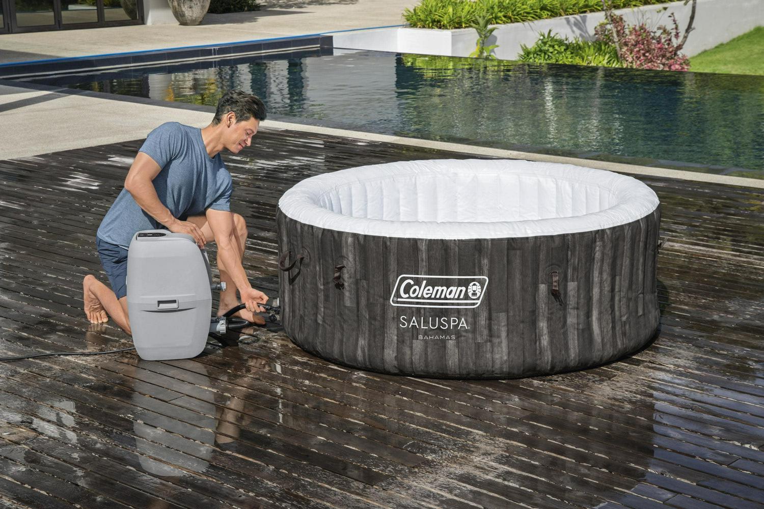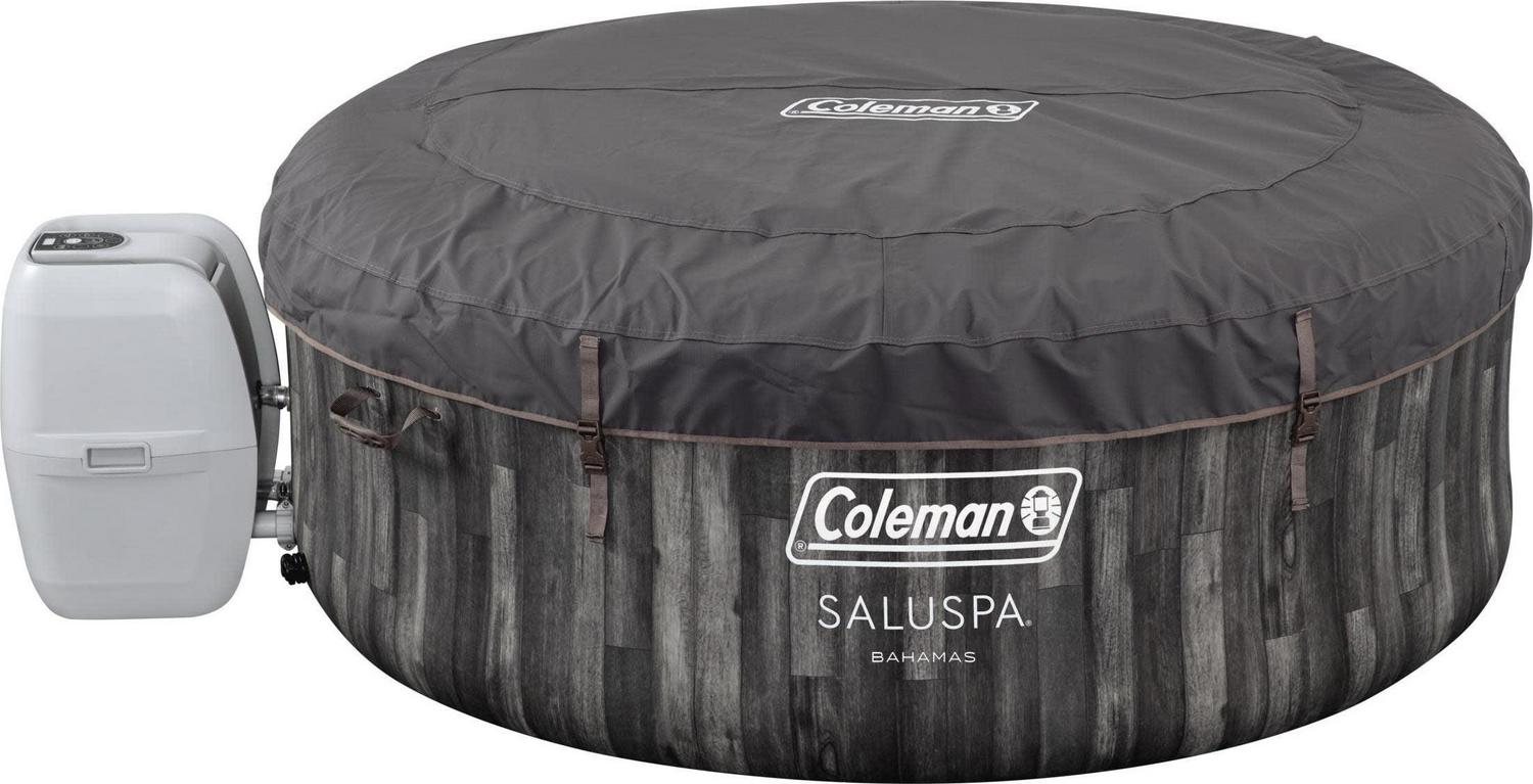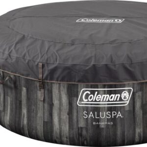 After a long day, there s nothing more relaxing than sinking into warm, bubbling water right in your own backyard. The Coleman SaluSpa Bahamas AirJet provides a soothing massage experience for up to 4 people, while still being quick and easy to set up. This spa reaches up to 104ªF (40ªC) to provide ultimate relaxation as you are surrounded by 120 AirJet massage bubbles and the tub holds up to 177 gal. of water. Simply attach the pump and watch as it inflates. Soothing Massage System: The AirJet system features 120 jets which release bubbles from the bottom of the spa to create a warm, bubbling hot tub environment. These soothing bubbles will help you relax and unwind right from the comfort of your home. Durable Construction: This spa s inflatable walls are made of durable, puncture-resistant, DuraPlus material which prevents damage. Compared to PVC, DuraPlus 3-layer material is 33% more tear resistant and 56% more stretch resistant. This type of internal construction prevents expansion over time, allowing the spa to retain the same shape no matter how many times it’s inflated and deflated. Innovative Winterizing Technology: The included Freeze Shield automatic heating function prevents inner components from freezing during colder temperatures. Designed with innovative winterizing technology, the system will keep the internal temperatures between 42º and 50ºF (6º and 10ºC) to prevent damage. Prioritizing Safety: Our spas feature a Ground Fault Circuit Interrupter system to help ground the product, preventing any potential electric shocks while the spa is in use. Contents: Equipped with a pump that quickly inflates the spa, heats it up, runs filtration and controls the massage system, this spa is both easy and convenient. The pump can easily be reached from inside the spa and features cup holders for drinks and snacks. Also included is a ChemConnect dispenser that maintains clean, healthy water by evenly dispersing the proper amount of chlorine. To top it all off, the Bahamas spa comes with a reinforced cover that locks in heat while not in use, as well as keeping dust and debris from collecting on the water. The Original Premium Portable Spa : SaluSpa is the original manufacturer of the world’s first premium portable spa. A little over a decade of advanced engineering innovations have built a name that consumers have grown to trust.