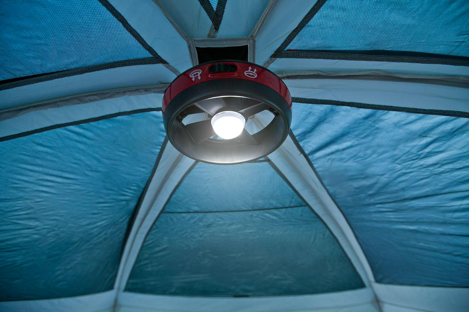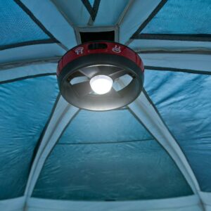 Keep the fun going after dark with the Coleman Prairie Breeze 8-Person Cabin Tent with Built-In LED Light and Integrated Fan. Its built-in LED lighting system provides bright, overhead illumination for reading a book or studying a map for the next day’s hike. An integrated fan provides cool comfort on hot days. If it rains, this tent will keep you dry thanks to Weather Tec technology, which uses a tub-like floor with patented corner welds, protected seams, and a covered zipper to help keep water out. Meanwhile, the strong frame is tested to withstand 35+ mph winds. You’ll get even more weather protection from an included rainfly. Setup is simple with snag-free, continuous pole sleeves. Both long and short adventures will be a pleasure, with vertical walls and enough room for everyone to stretch out and relax on 2 queen-size airbeds. When it’s time to head home, the tent fits into an included carry bag for easy storage and transport.