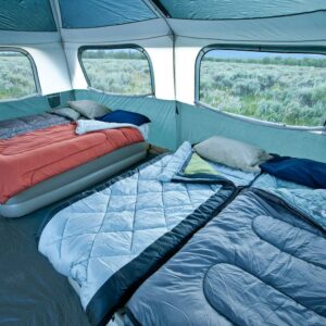 – Spacious 14 ft. x 10 ft. tent fits 2 queen-size airbeds; 7 ft. center height and vertical walls for more living space; 6 oversize windows for enhanced ventilation